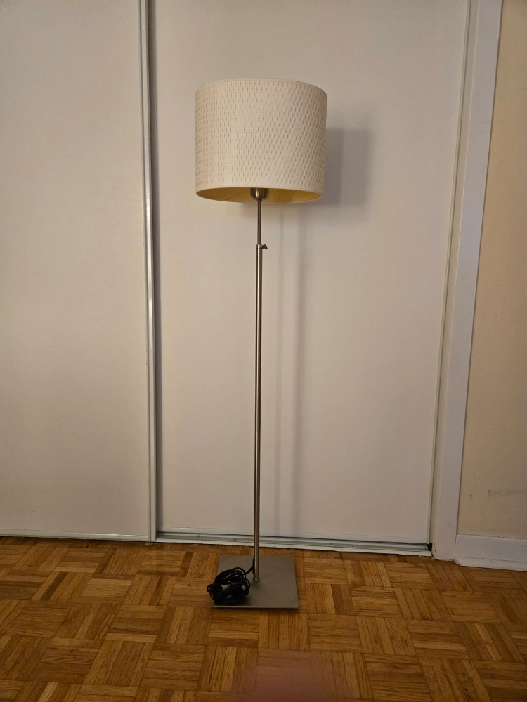 Floor lamp with a white shade, silver base, and black cord. bulb not included