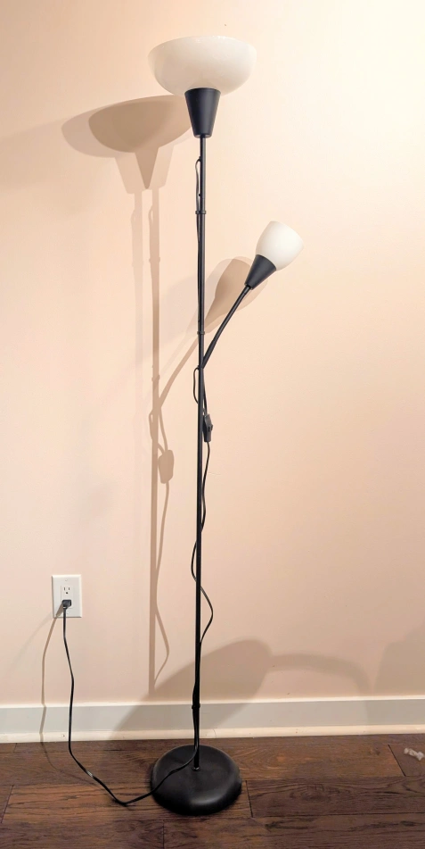 35Two-light floor lamp. Black metal frame. White shades. Excellent for reading or ambient lighting. Pre-owned.
