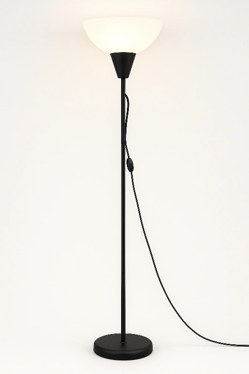 The lamp features a white shade. The base is round, and black. The lamp body is straight. Light bulb not included