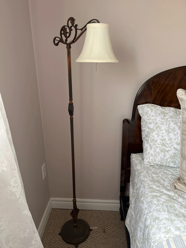 15This is a used floor lamp with a decorative wrought iron look and a cream-coloured fabric shade, perfect for adding a touch of elegance to any room. It stands at approximately 5 feet tall and provides a warm, ambient light. There are some minor signs of wear, but it remains fully functional and aesthetically pleasing. * Height: Approximately 5 feet * Shade: Cream fabric * Style: Decorative, wrought iron look If the ad is up, it's still available!