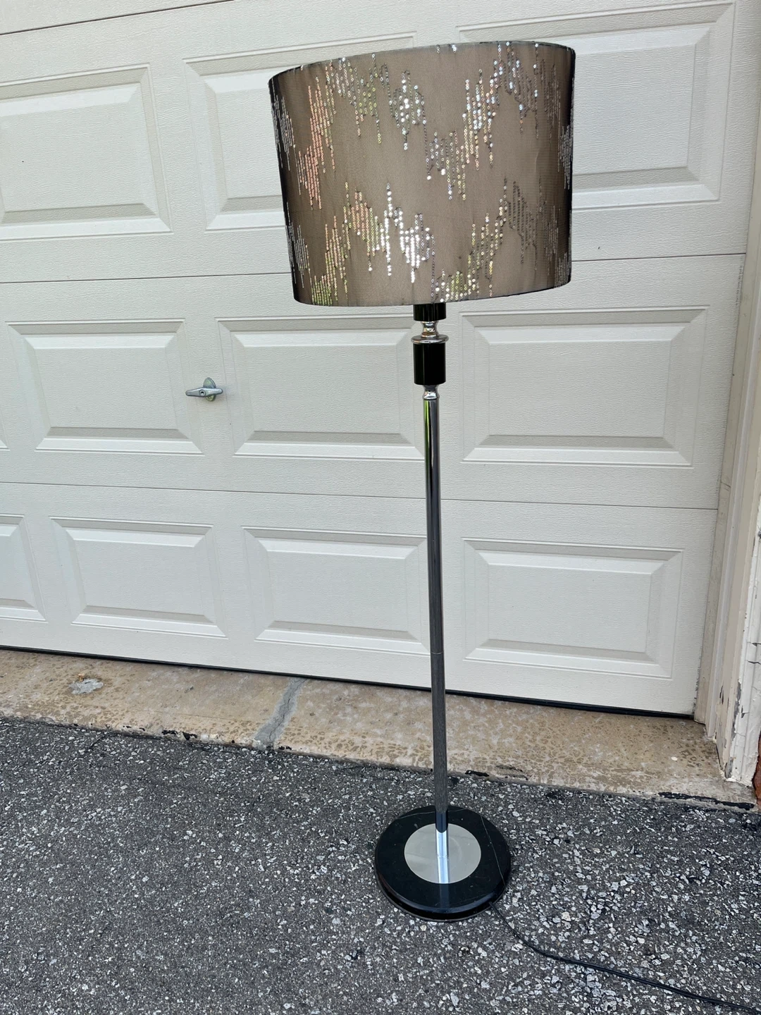Selling a floor lamp with a unique patterned shade. It's a stylish addition to any room. The lamp has a sleek, modern design with a chrome finish and a black base. The shade features a shimmering pattern that adds a touch of elegance. Perfect for creating a warm and inviting atmosphere in your home