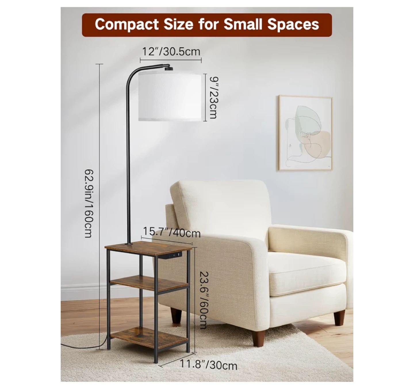 15This floor lamp has a compact size, perfect for small spaces! It measures 12"/30.5cm wide, 9"/23cm in diameter, 62.9in/160cm high, with shelves at 15.7"/40cm and 23.6"/60cm heights, and a shelf depth of 11.8"/30cm It also comes with a remote!