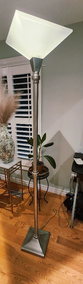 15Selling a floor lamp with a square shade. It has a sleek and modern design, perfect for adding some light to any room. The base is sturdy and the shade provides a nice, diffused light. Great condition!