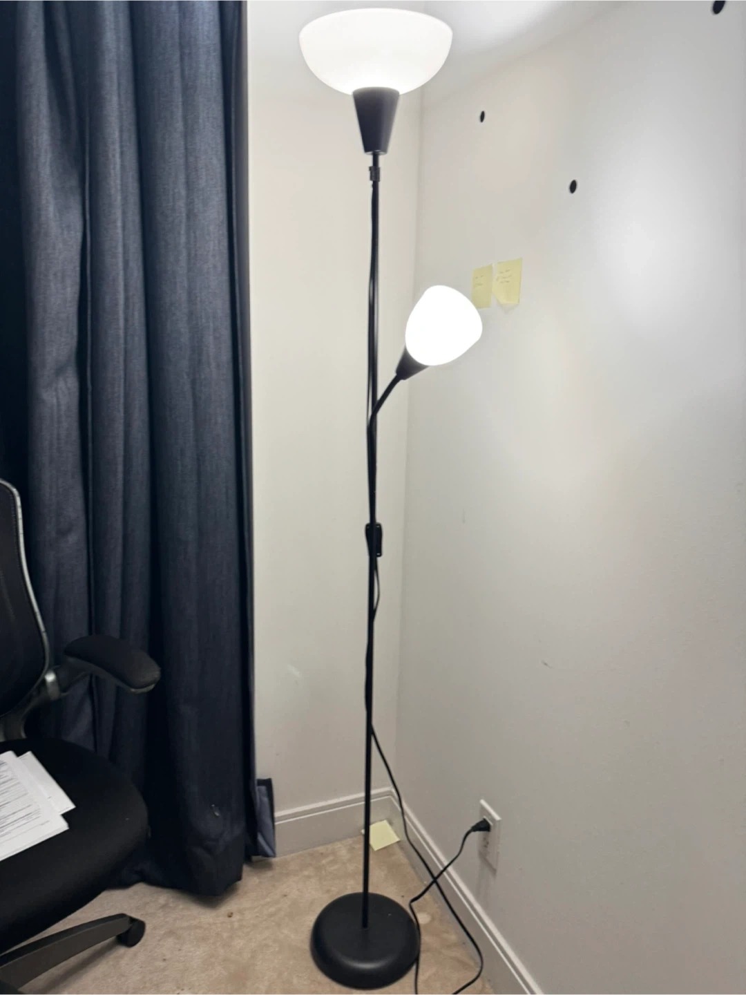Selling a floor lamp with two lights. It features a tall, slender design with a round base and two adjustable lights, perfect for any room needing extra illumination