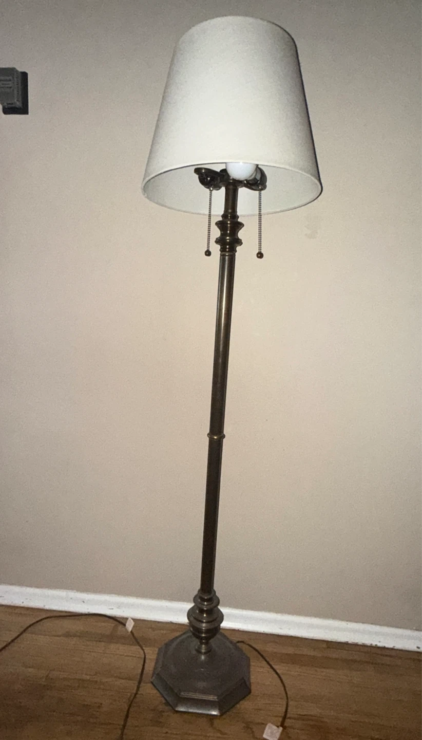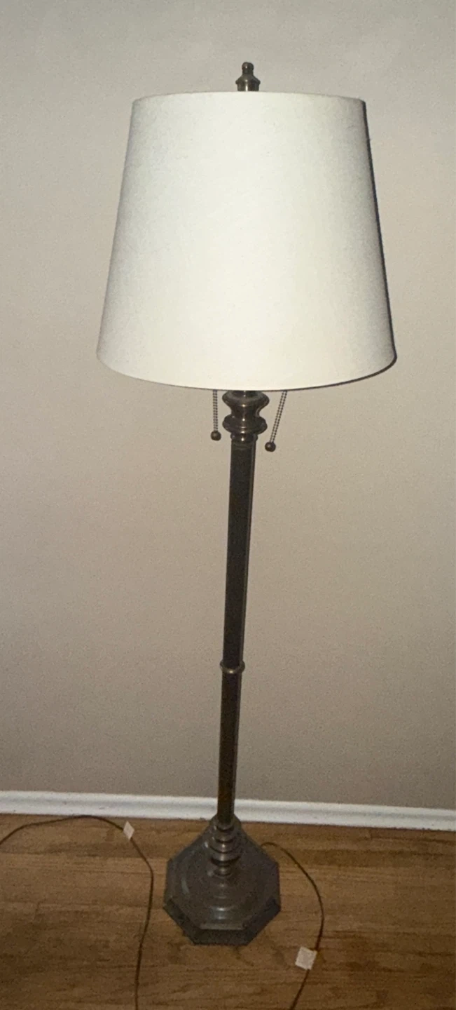 Selling a floor lamp with a classic design. It has a white shade and a dark metal base. It's in great condition and would look lovely in any living room or bedroom. It provides a warm and inviting light