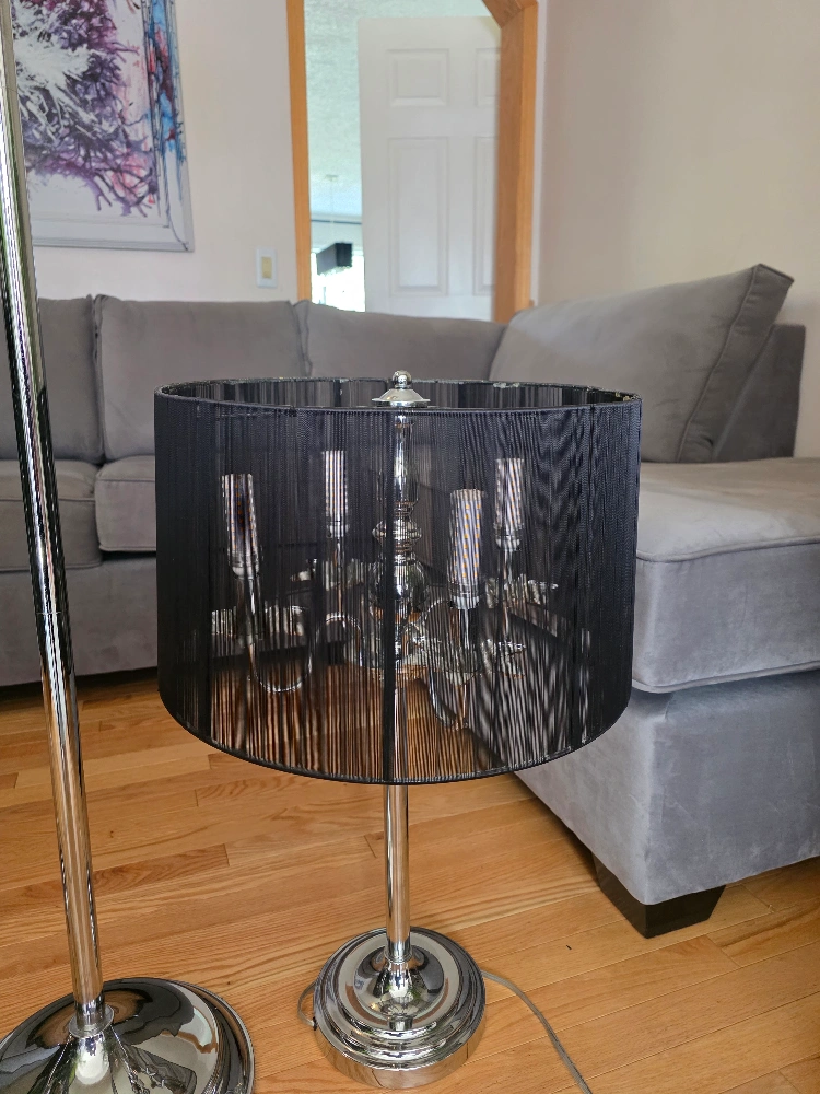 Selling a stylish floor lamp and two matching table lamps. They feature a sleek chrome finish and elegant black shades. These lamps will add a touch of sophistication to any room