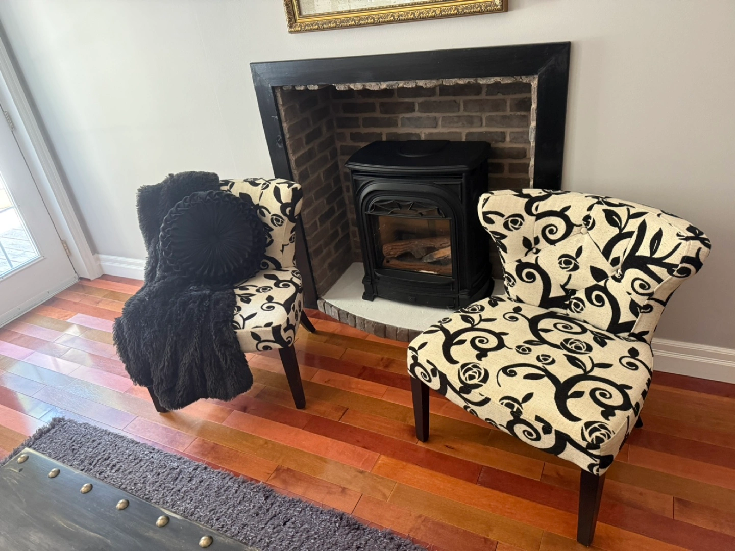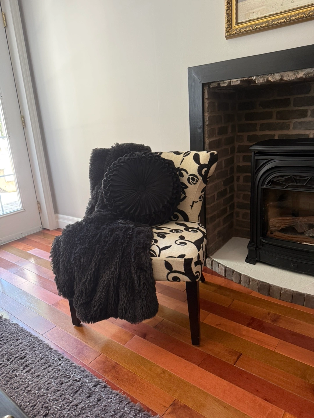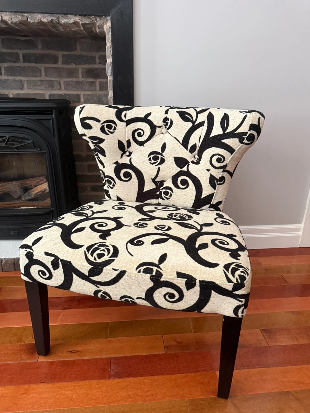 Selling a lovely accent chair with a black and white floral pattern! It would look great in any living room or bedroom. The chair is in great condition and ready for a new home 120 for both chairs :)