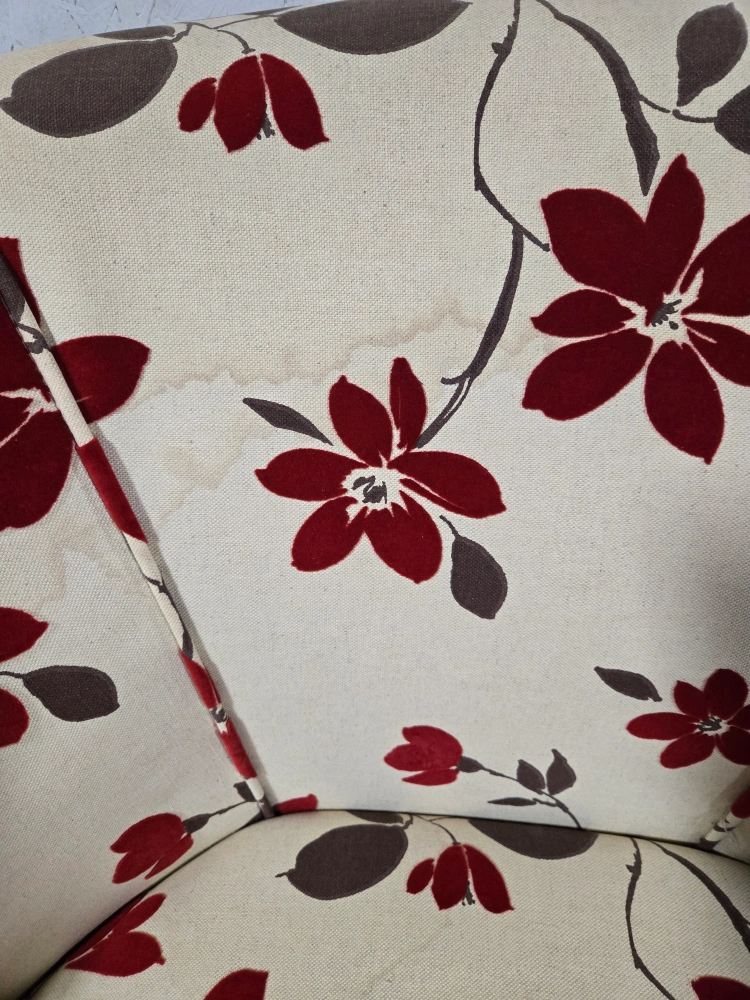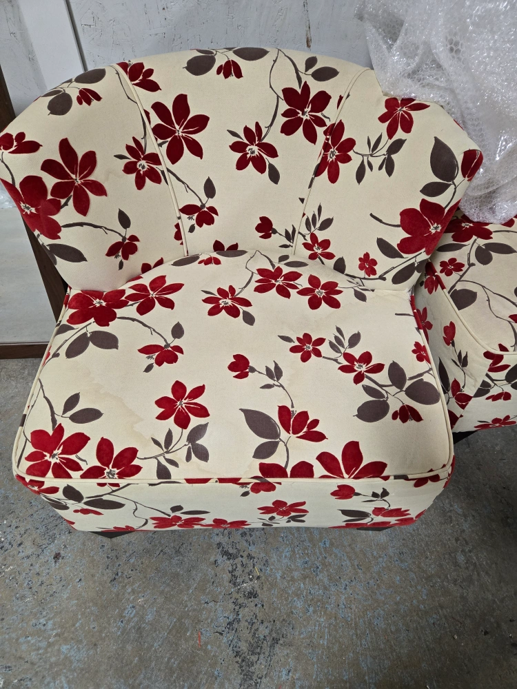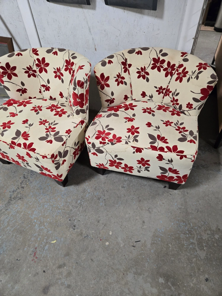 Selling a set of two accent chairs with a floral pattern. They're perfect for adding a pop of colour and style to any room. Please note that there are some stains on the fabric, as shown in the photos. 26 x 29 x 26