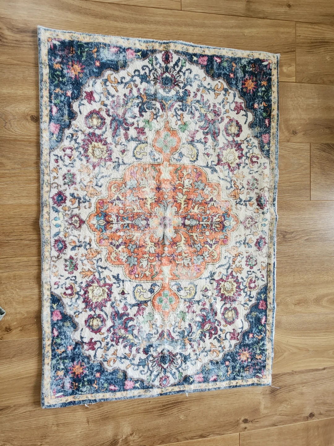 906Meet up at 40 Lavery Trail Scarborough or 280 Donlands Avenue. Selling a lovely floral area rug with a mix of blue, orange, and white colours. It's in great condition and would look fantastic in any room. Machine washable as well. Currently freshly washed for a new home. 24 x 36 inches dimensions.