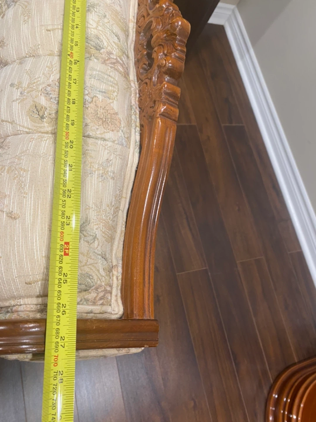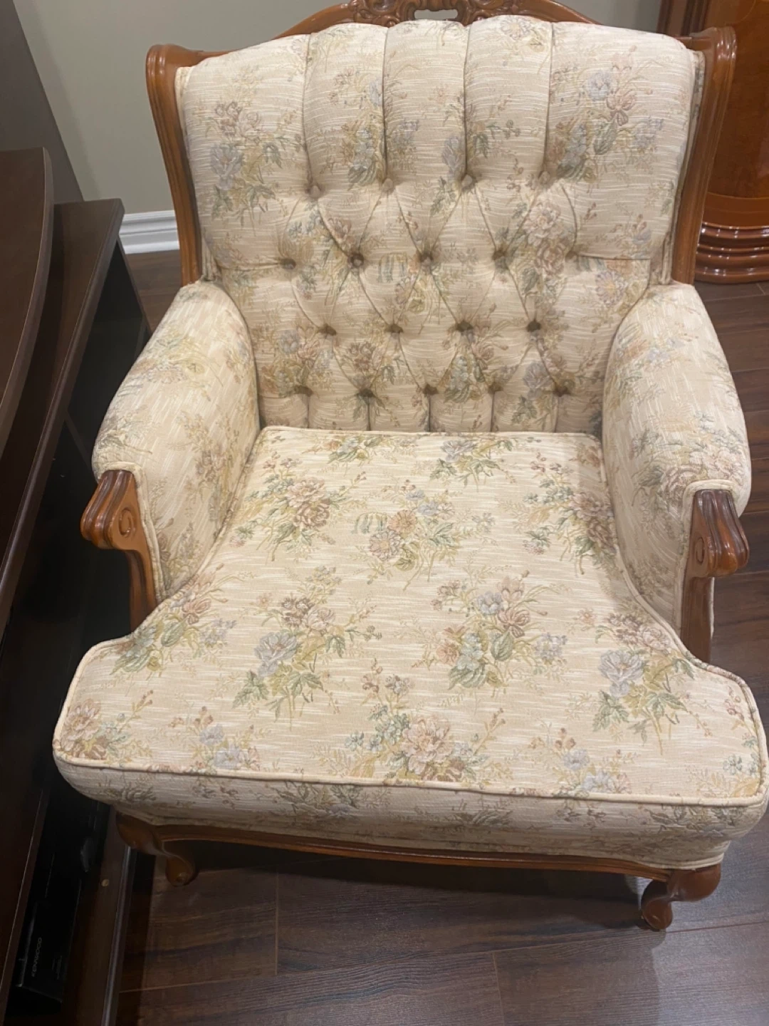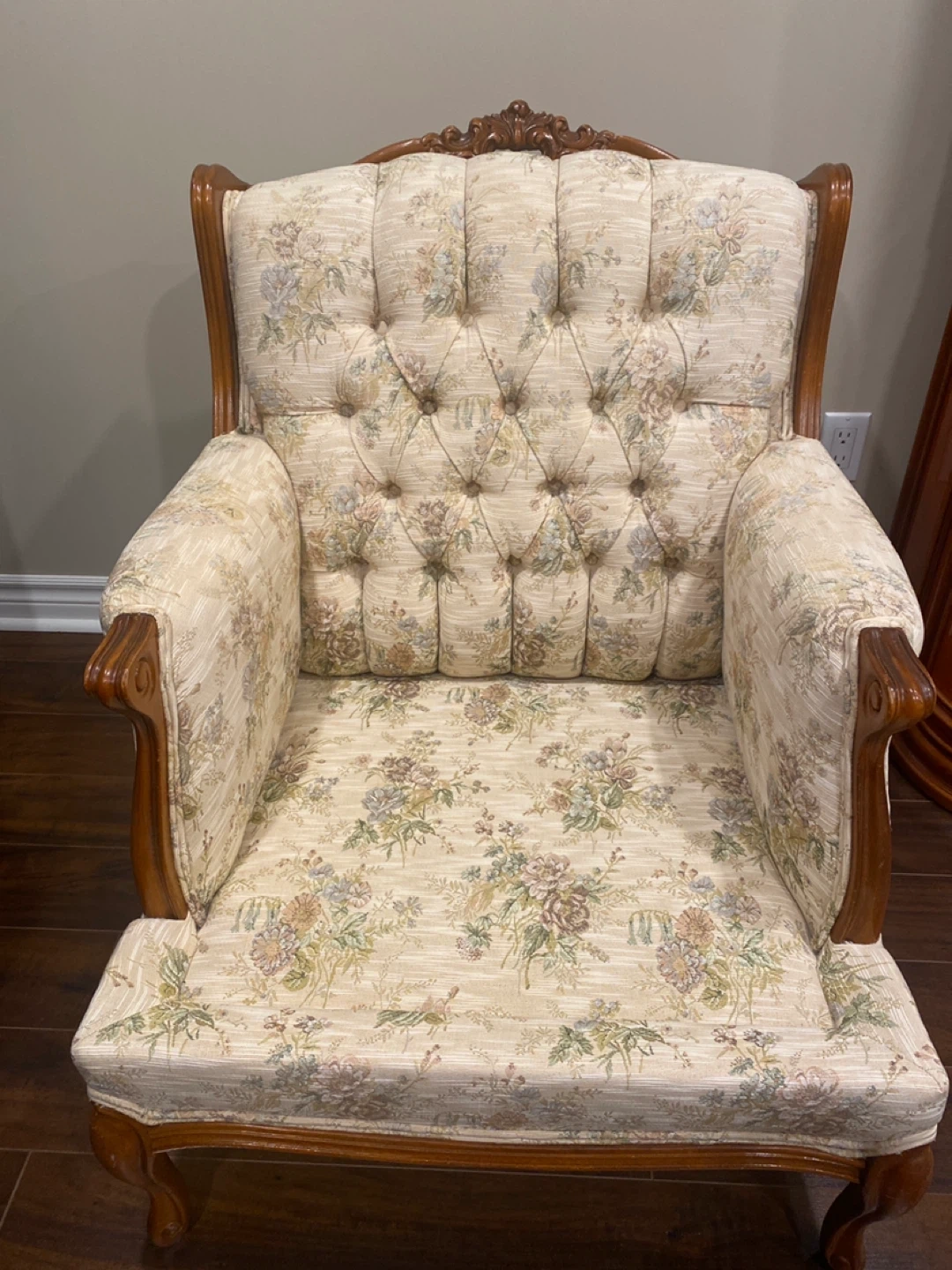 Selling a beautiful armchair with a floral pattern. It has a wooden frame and a comfortable, cushioned seat and back. It's in great shape and would be a lovely addition to any living room or bedroom