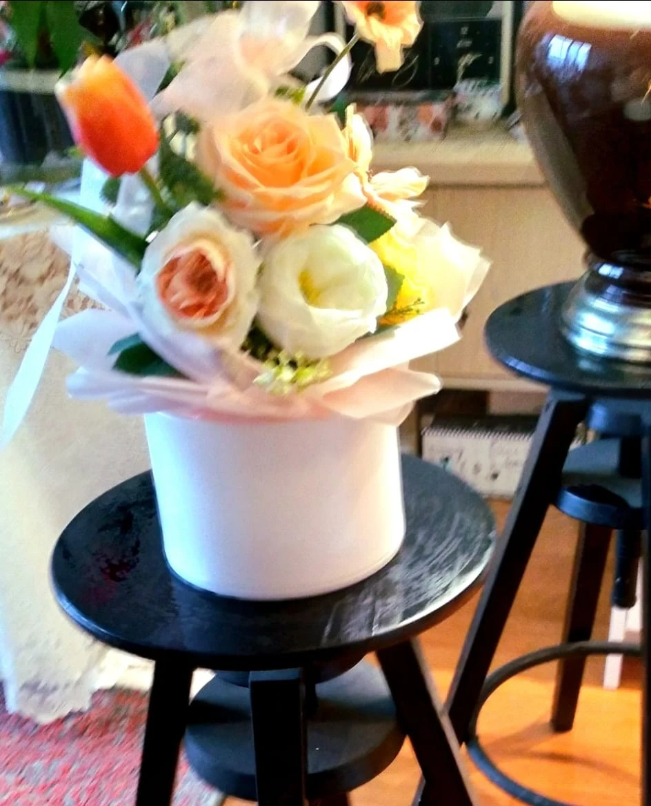 189A lovely floral arrangement featuring roses and tulips in a simple white pot. It would make a beautiful addition to any room!