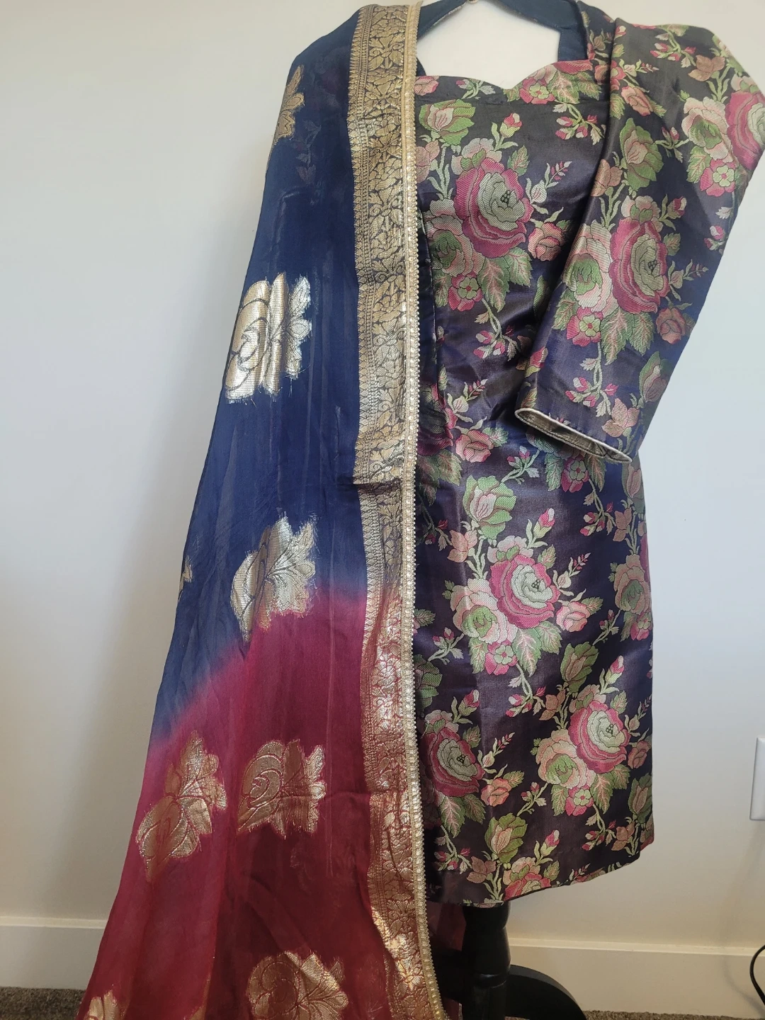 Beautiful salwar kameez with a floral brocade pattern! The set includes a matching dupatta with a gold trim, perfect for special occasions or everyday wear