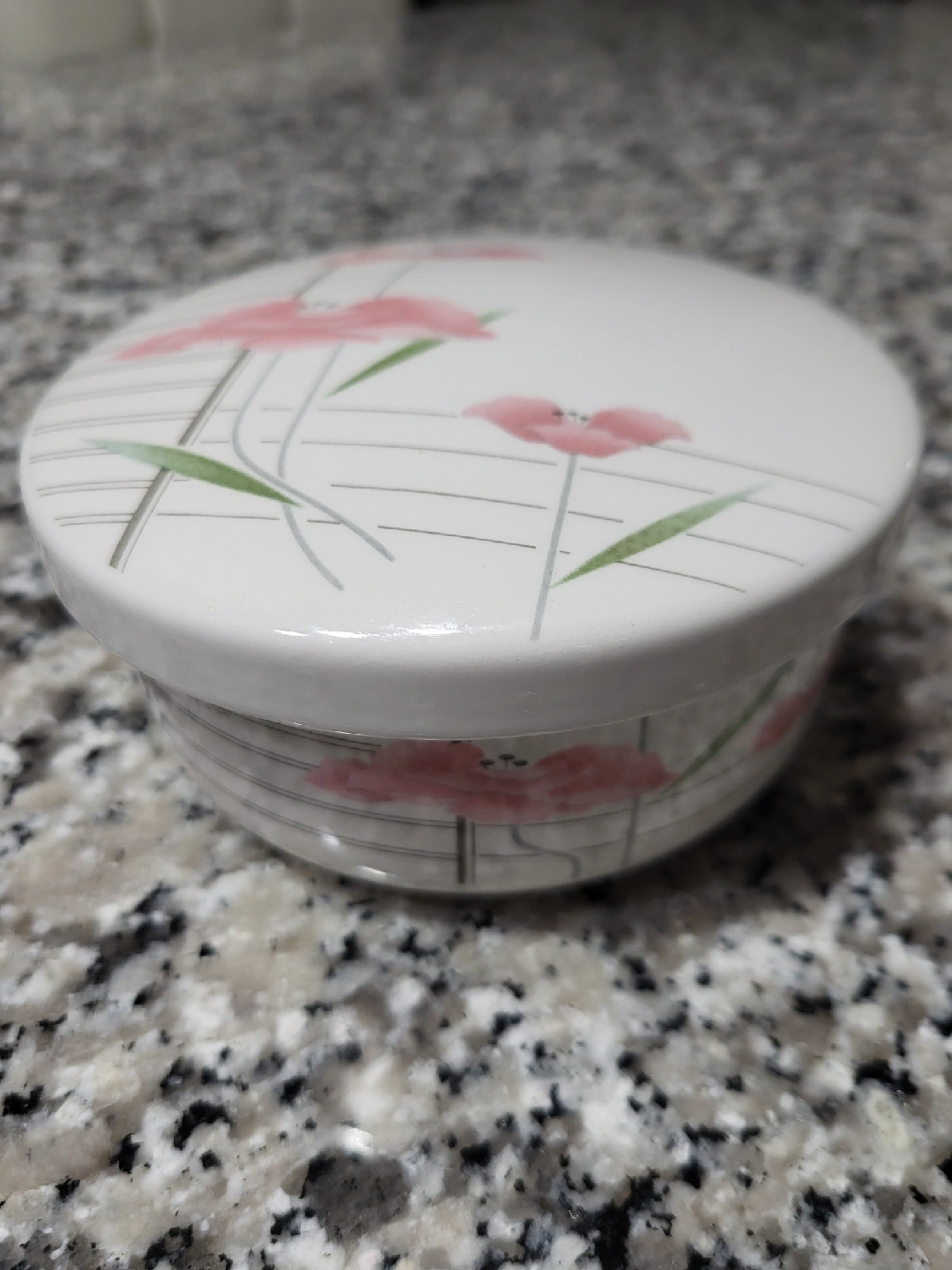 25A charming little trinket dish with a delicate floral design! It's perfect for holding jewelry, small keepsakes, or even just adding a touch of sweetness to your space. The ceramic material gives it a nice weight and feel 🥕