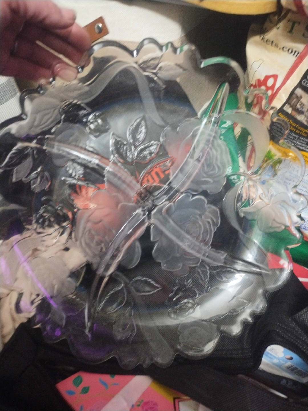 10Selling a clear glass platter with a floral design. It's in good condition and would be perfect for serving snacks or desserts at your next gathering
