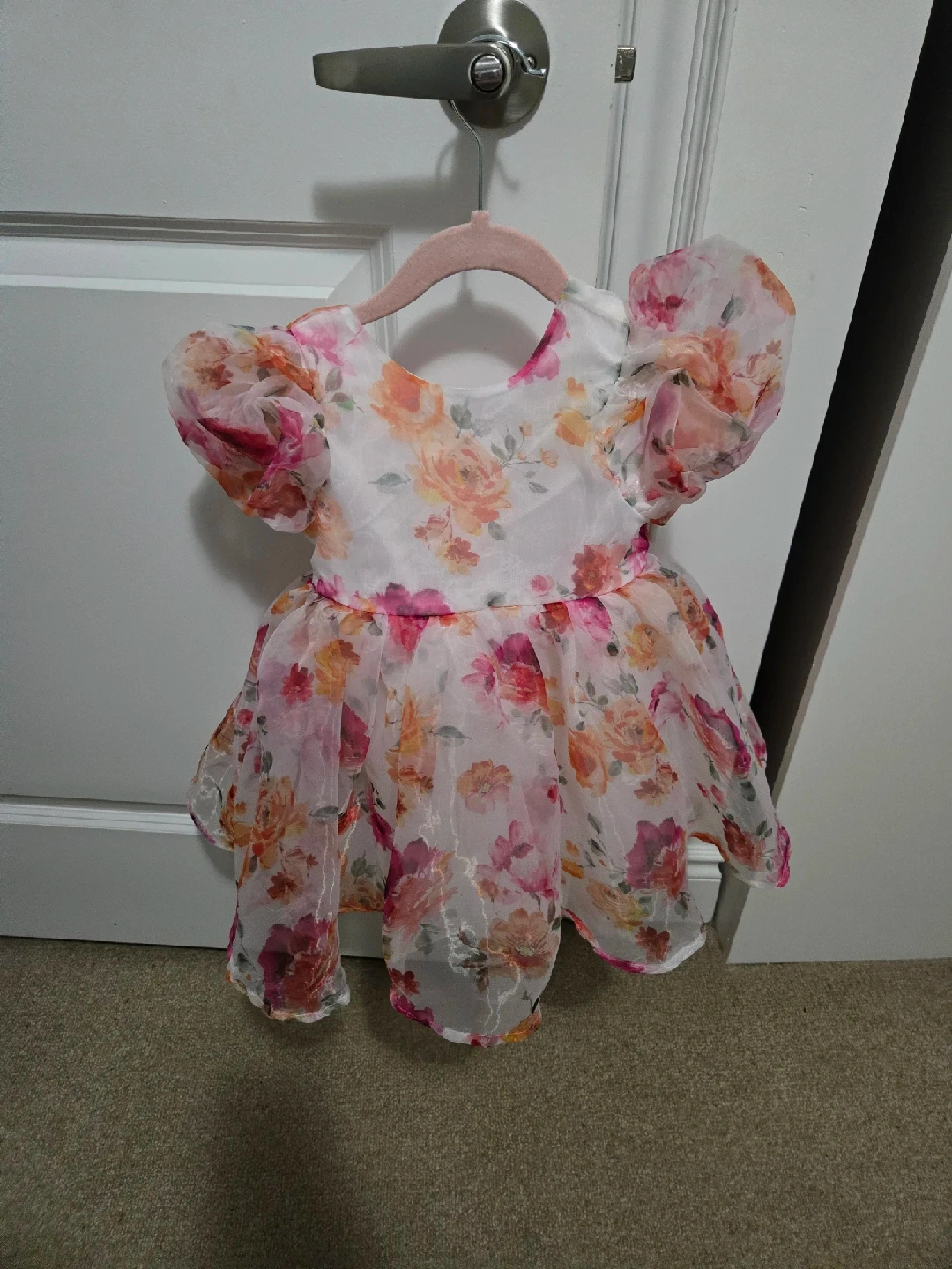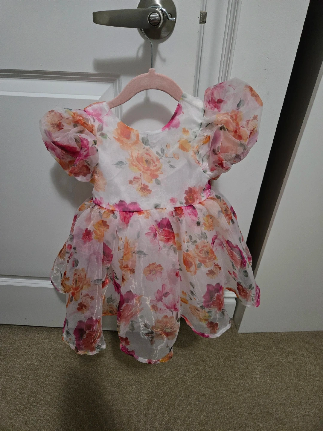 60Selling a beautiful floral dress, perfect for a baby or toddler! The dress features a lovely floral pattern with pink and orange hues. It has short, puffy sleeves and a layered skirt. It's in great condition and ready for a new little owner