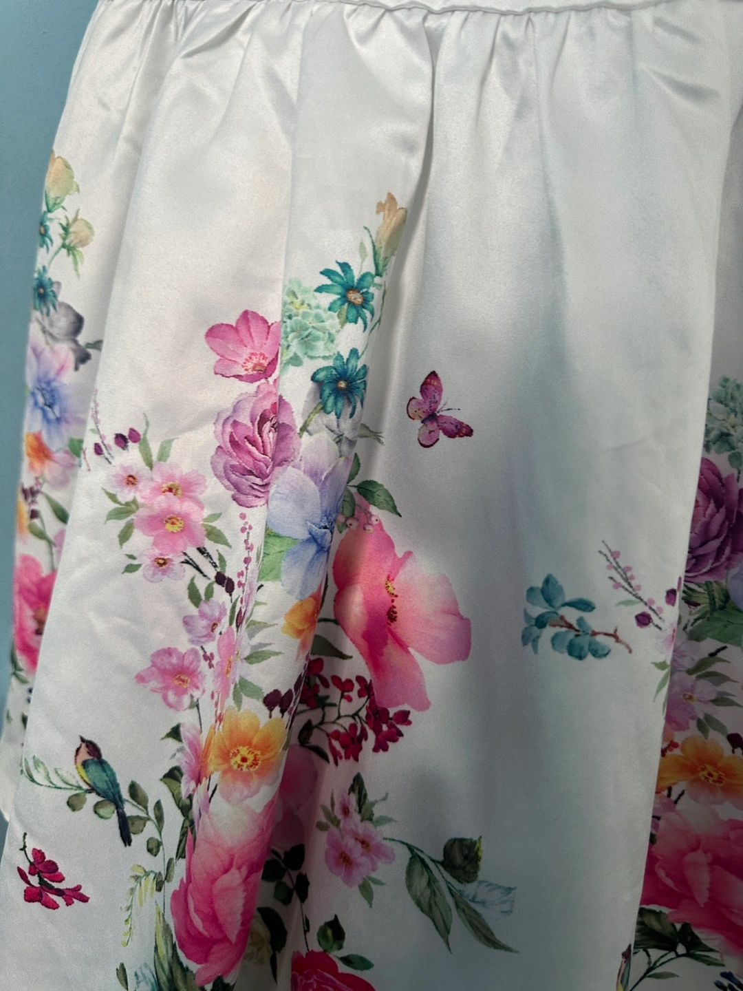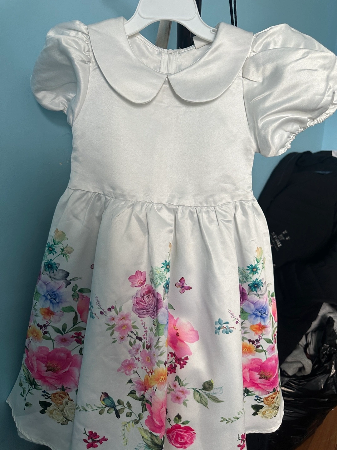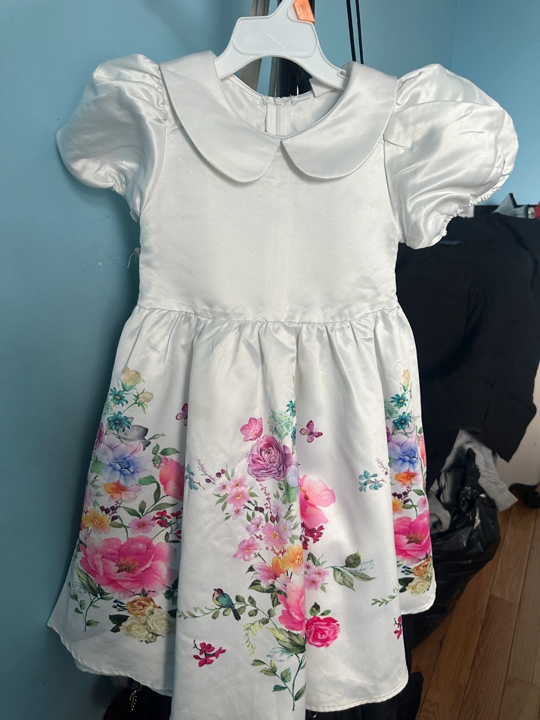 This adorable dress is perfect for parties or special occasions! It features a beautiful floral pattern on the skirt and a classic Peter Pan collar. The dress is in great condition and ready for a new home. It's sure to make your little one feel like a princess!