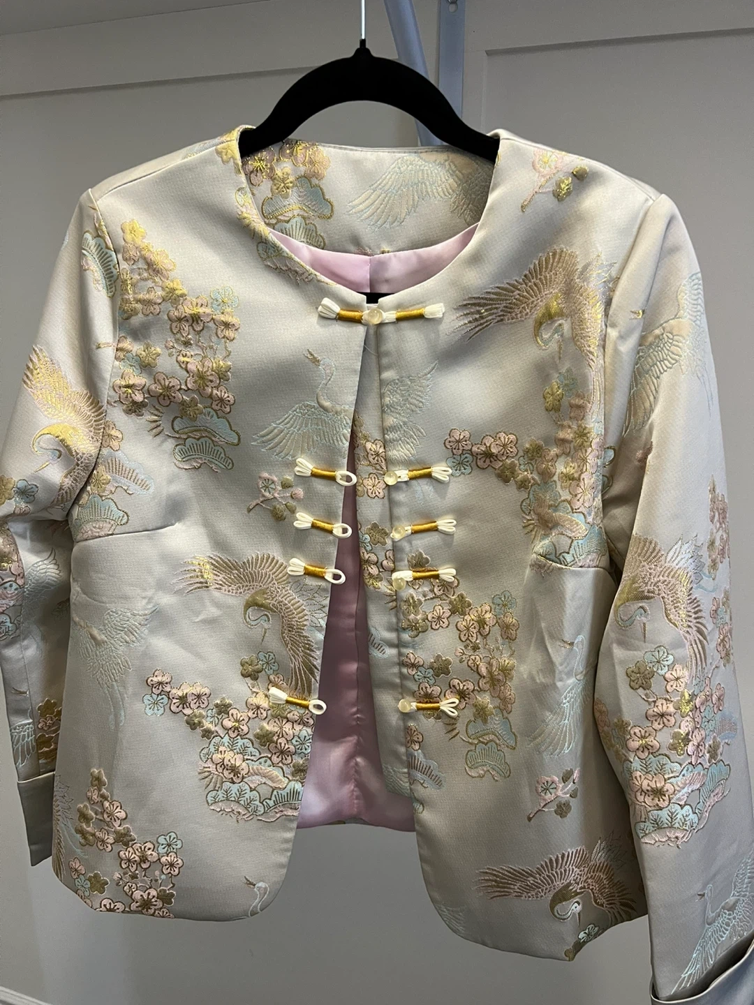83Here's a beautiful jacket with Asian-inspired embroidery! It features cranes and floral designs in shades of pink, blue, and gold. The jacket has unique toggle-style closures. It's in great condition and ready for a new home!