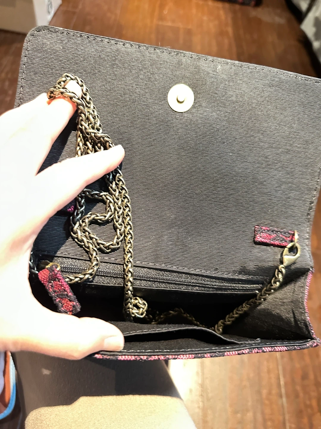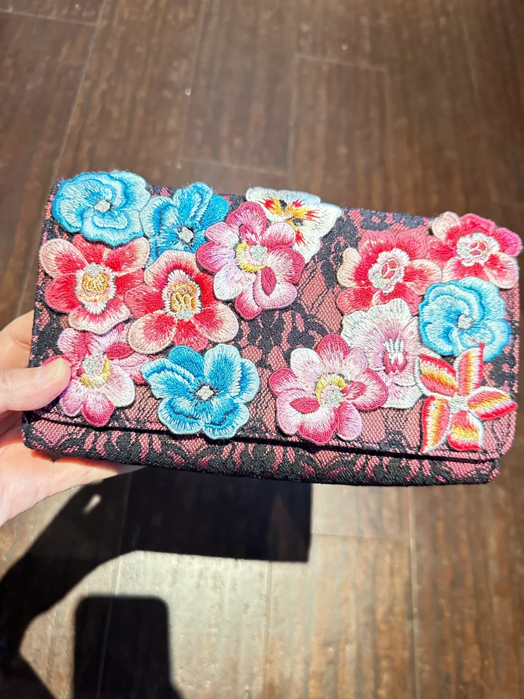 127‼️‼️ Pick up only near Shopsatdonmills or Scarborough Town Center‼️‼️ This cute clutch is adorned with colourful floral embroidery on a black lace background. It features a chain strap for easy carrying. The inside has a zippered pocket and a few compartments to keep your essentials organized. Perfect for a night out or a special occasion!