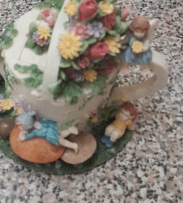 144A beautiful floral fairy figurine! It has a lovely arrangement of flowers and cute little fairies. It would be a great addition to any collection or a sweet decorative piece for your home