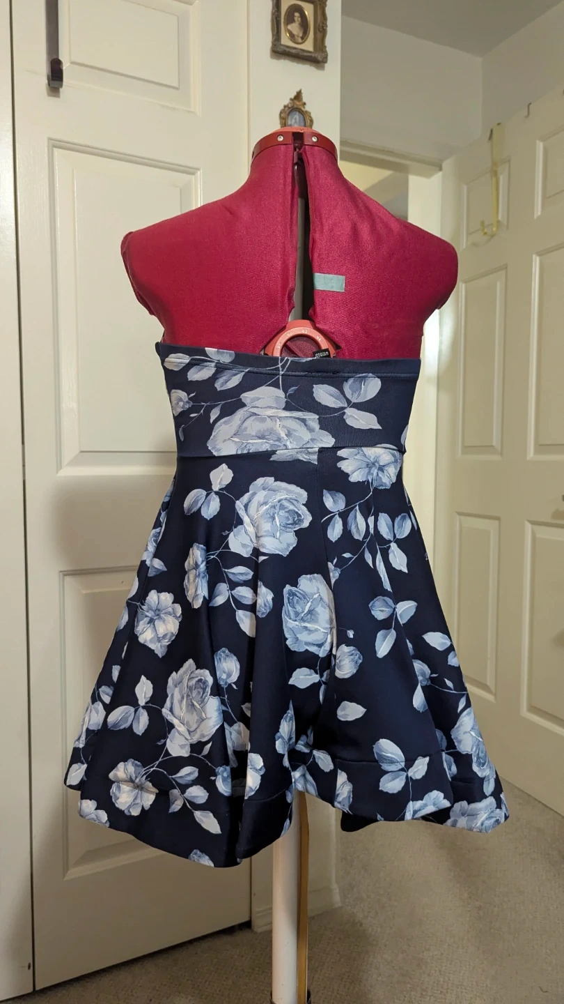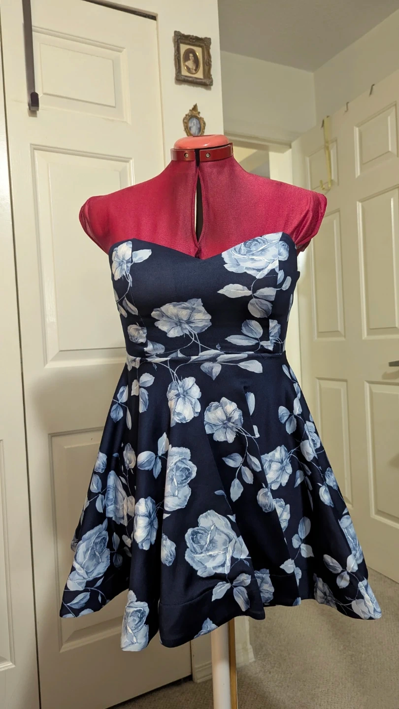 86This dress is a beautiful navy blue with a white floral pattern, perfect for a special occasion or a night out! It's a fit and flare style, which is super flattering. The dress is in great condition and ready for a new home. I never even wore this one! Summer stock downsizing for move.
