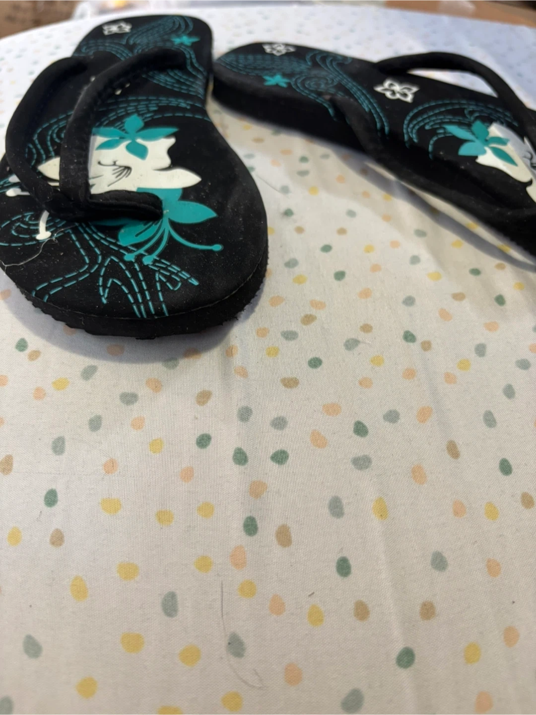 71Cute pair of flip flops with a floral design! They're black with a white and teal flower pattern. Size 6-7 and in great condition!