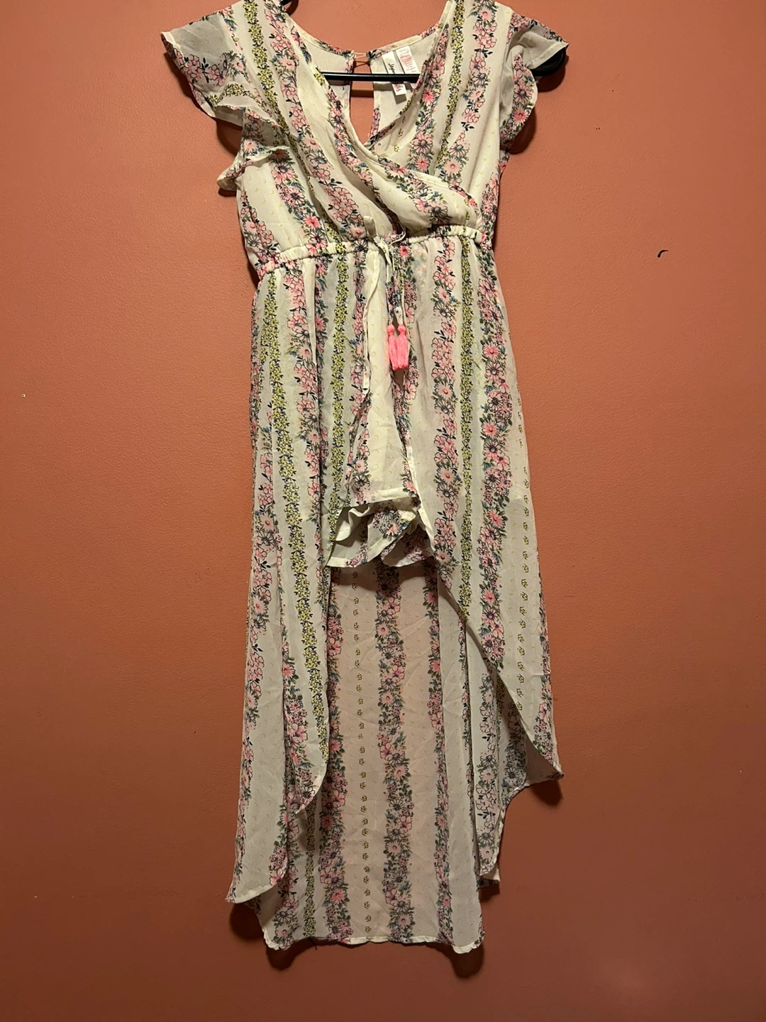 This is a cute floral print hi-lo shorts romper It's a size small and has a flattering silhouette. Perfect for summer days!