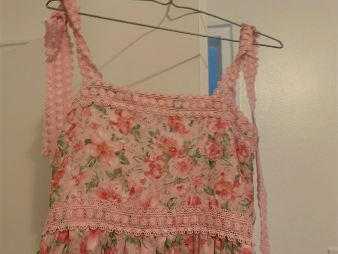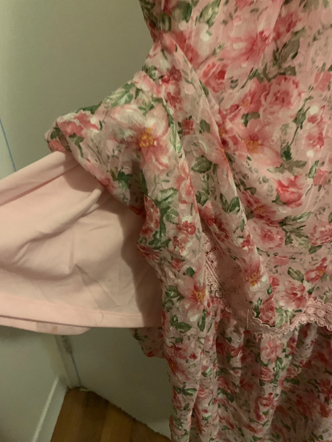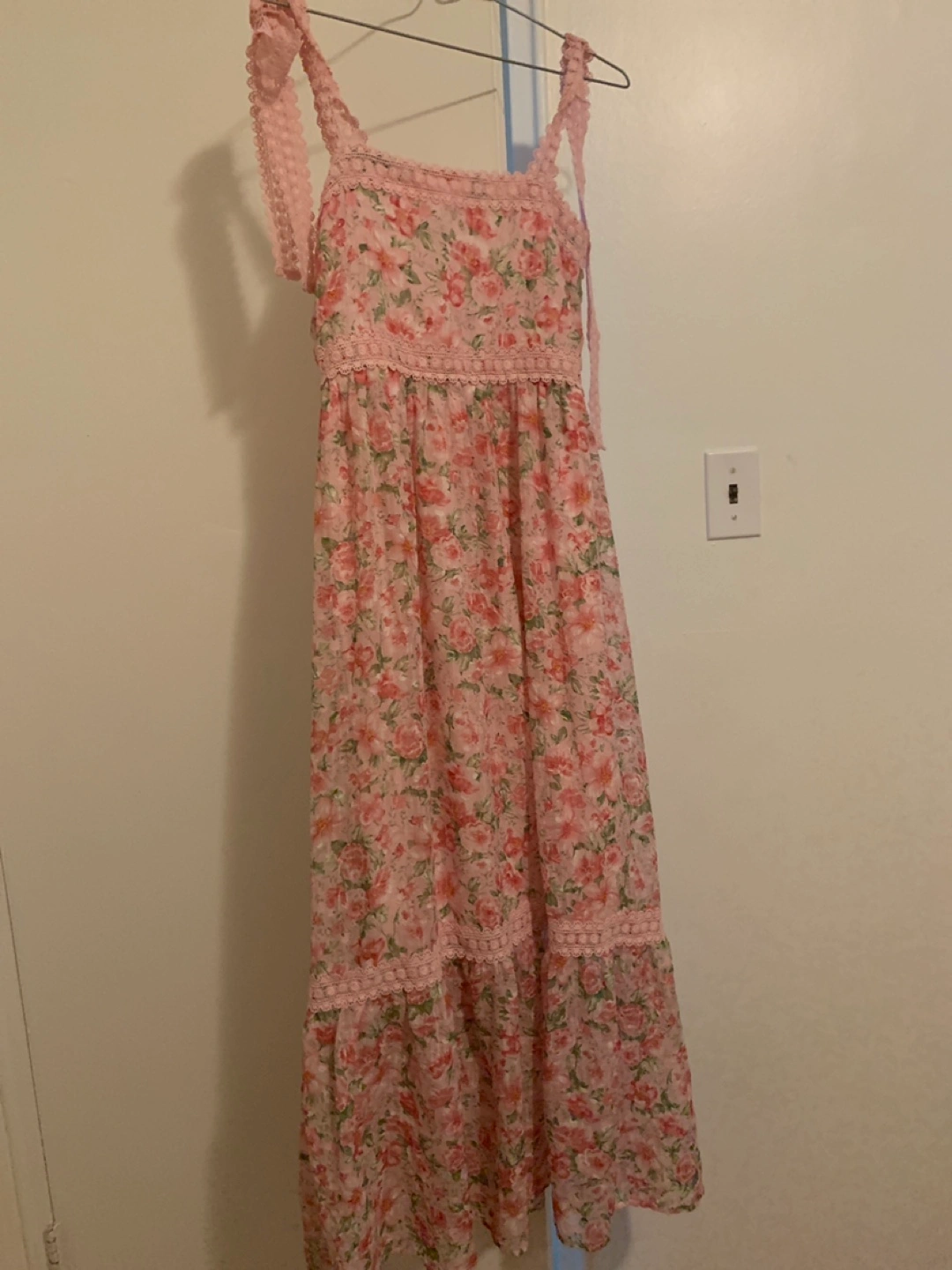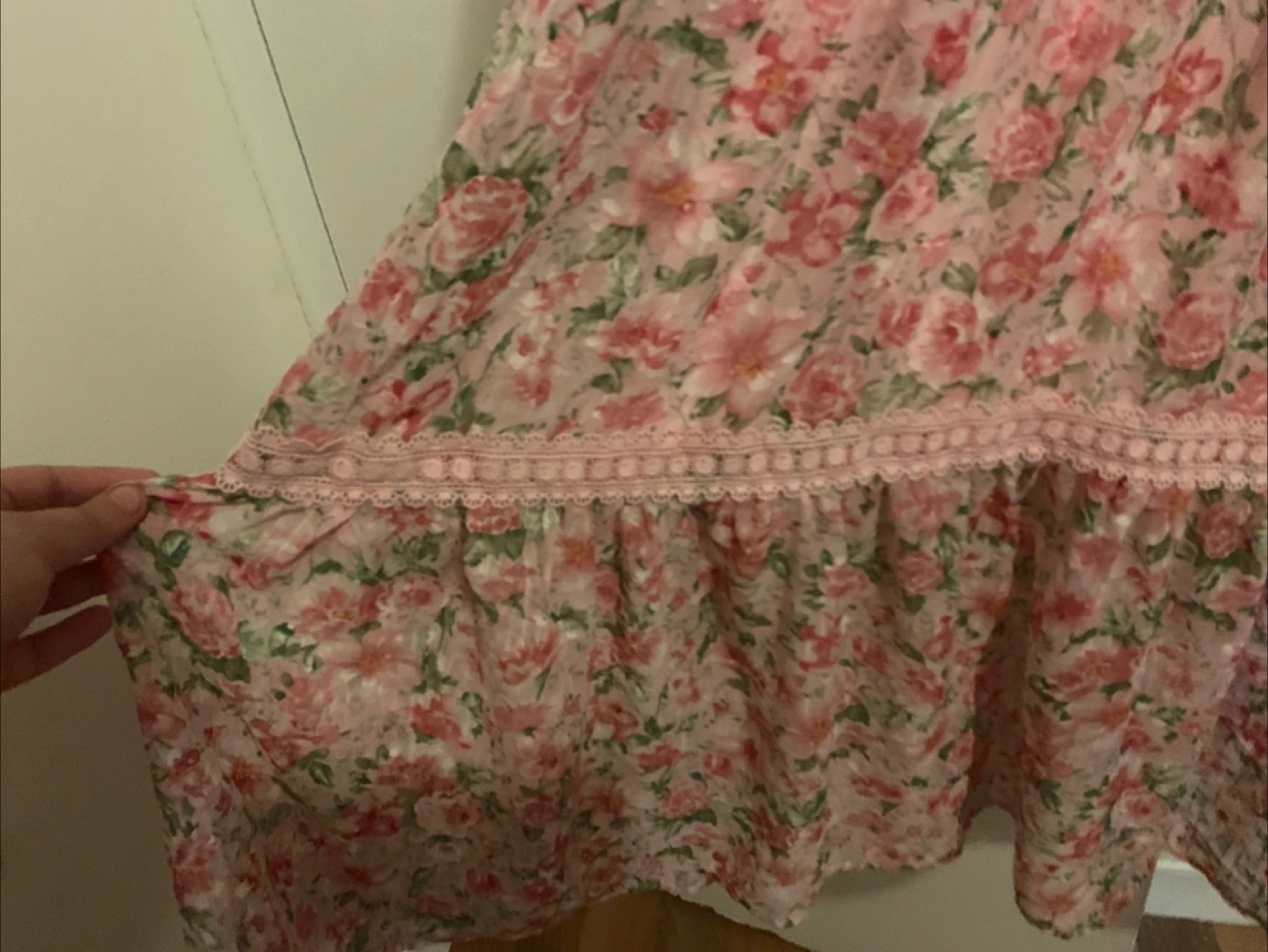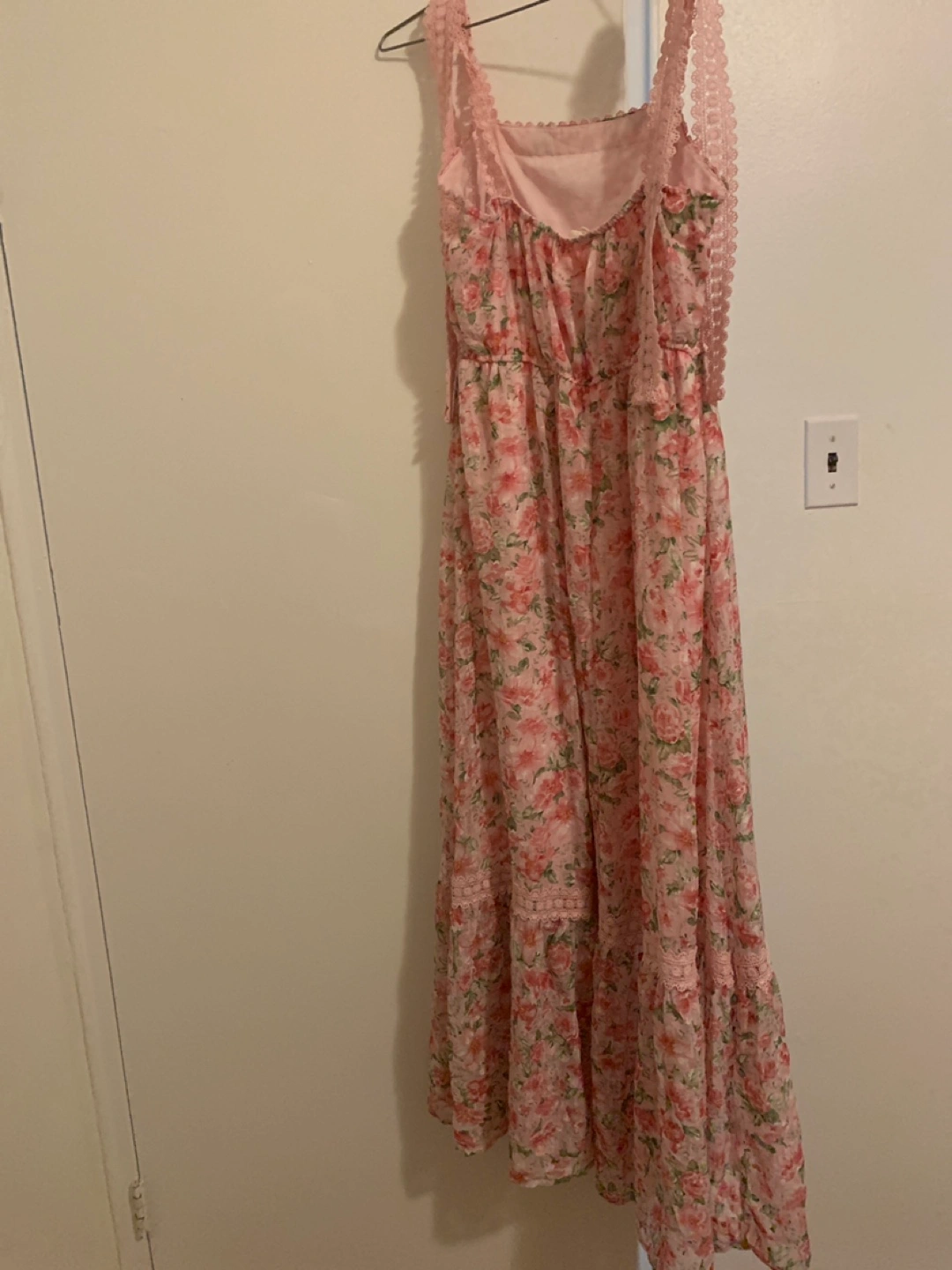 Selling a floral maxi dress with lace detailing, has an under skirt installed in the dress for extra comfort and security, size medium.