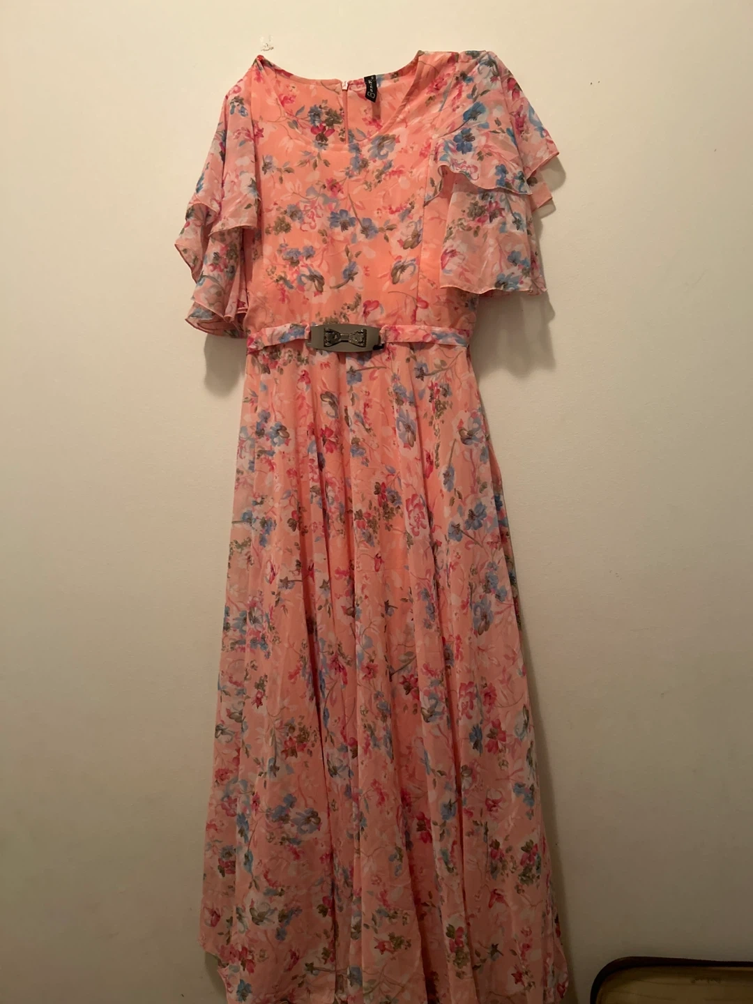 Selling a lovely floral maxi dress in a peach colour. It features a flowy design with ruffled sleeves and a belted waist. Perfect for summer days or special occasions!