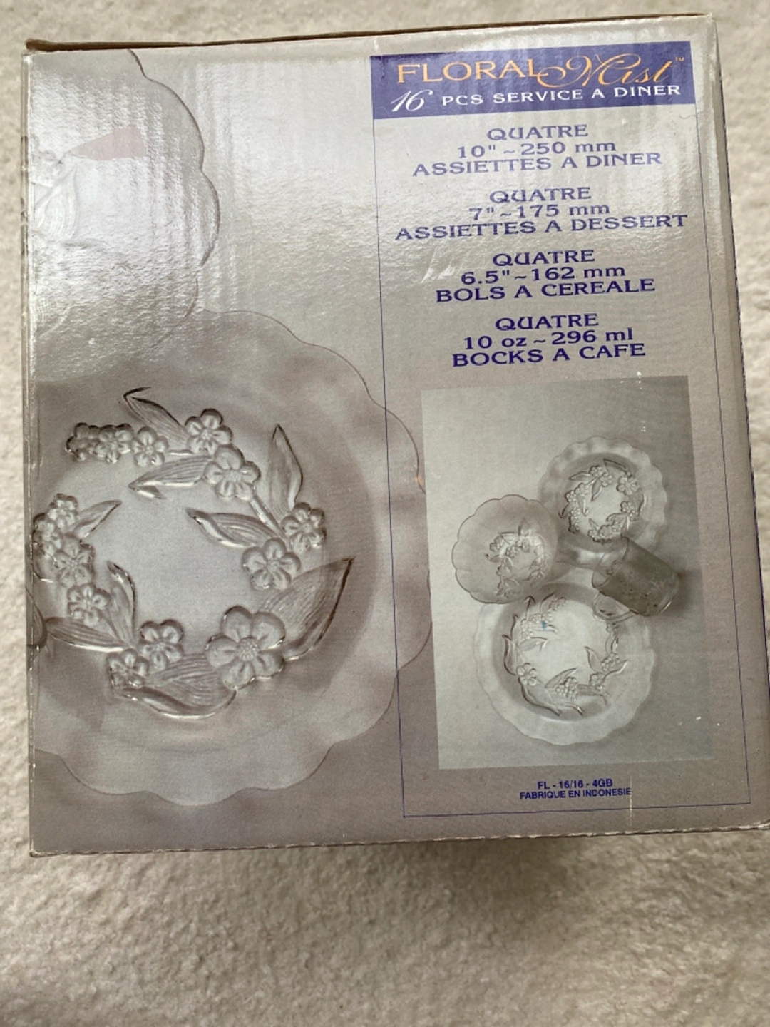 Set of 16 pieces, includes four dinner plates, four dessert plates, four cereal bowls, and four mugs. Floral pattern with clear glass. Made in Indonesia. Never open. Pick up near steeles and Bathurst