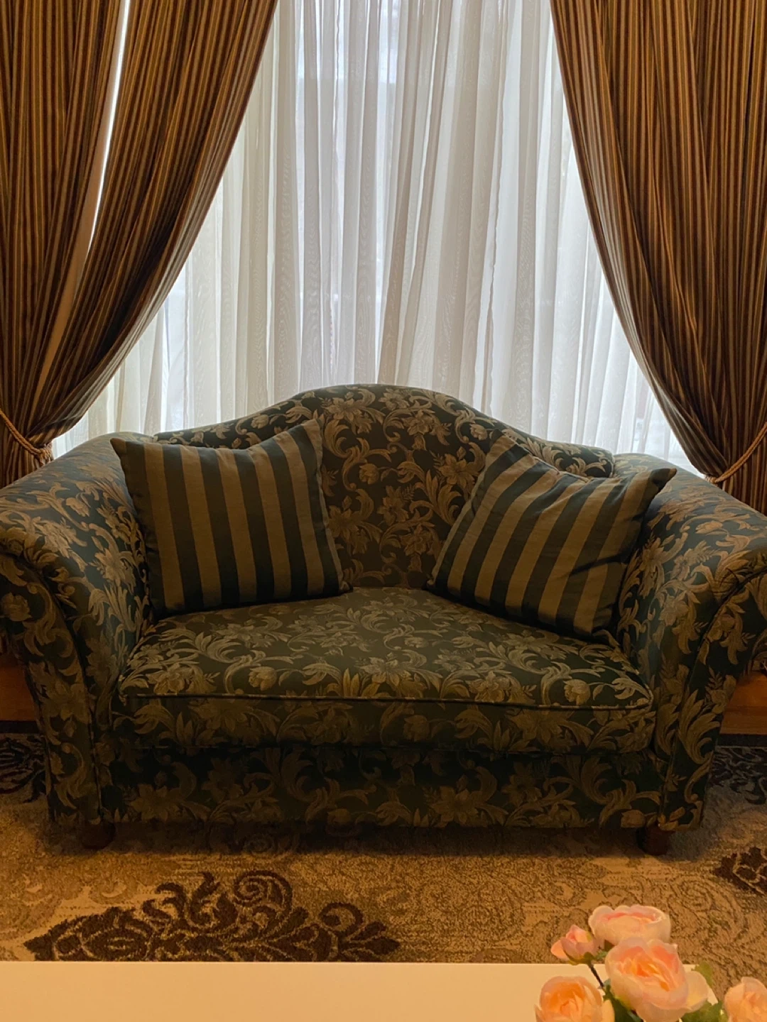 20Selling a cozy loveseat with a lovely floral pattern! It comes with two matching striped pillows. Perfect for a smaller space or as an accent piece in a larger room. It's in great condition and ready for a new home! I have 2 the same sets if you need more than one. Both sets I can let go for $350 cash