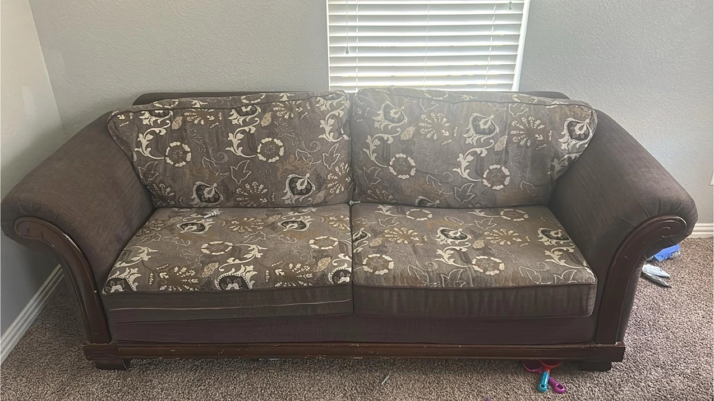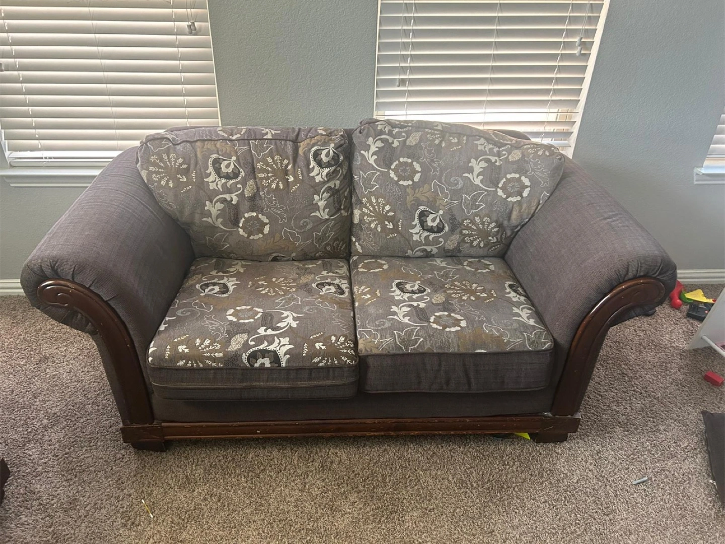 18A comfy sofa set with a floral pattern. It's in good condition and ready for a new home. The color is a mix of brown and tan, making it easy to match with any decor. Perfect for a small space! Seating Capacity: 3 + 2 Comes from a pet and smoke free home.