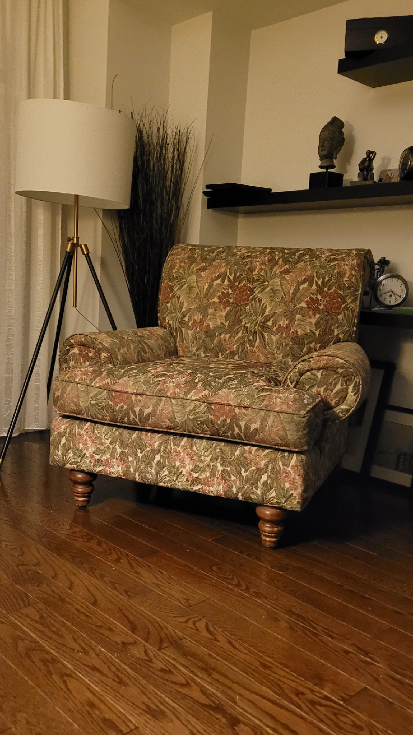 2 cozy armchair with a lovely floral pattern! they are in great condition and would be a wonderful addition to any living room or reading nook. The armchairs features a classic design with comfortable cushions and sturdy wooden legs.
