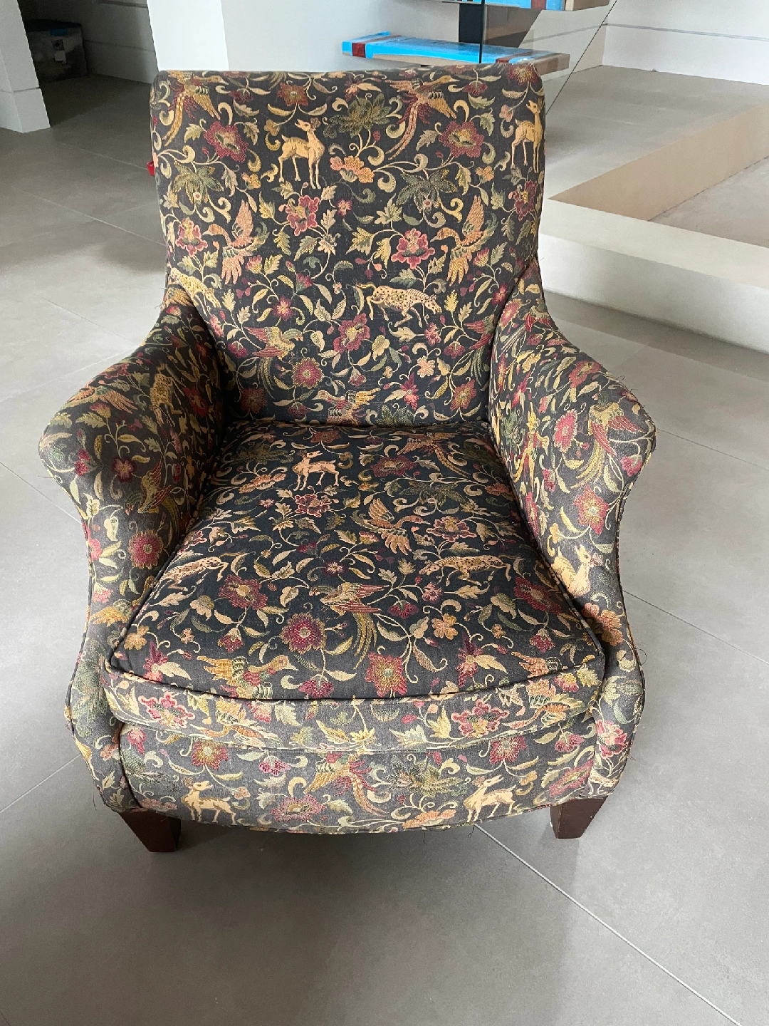 Selling a cozy armchair with a unique pattern in earth tones! It's in great condition - slight fading of the material - and would be a great addition to any living room or reading nook