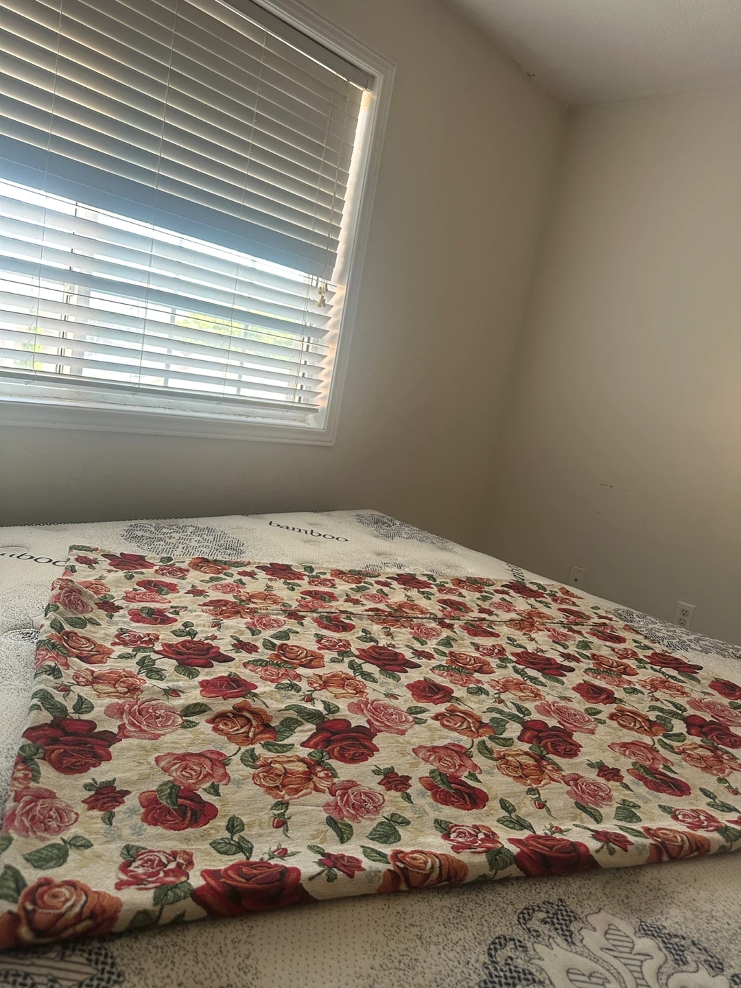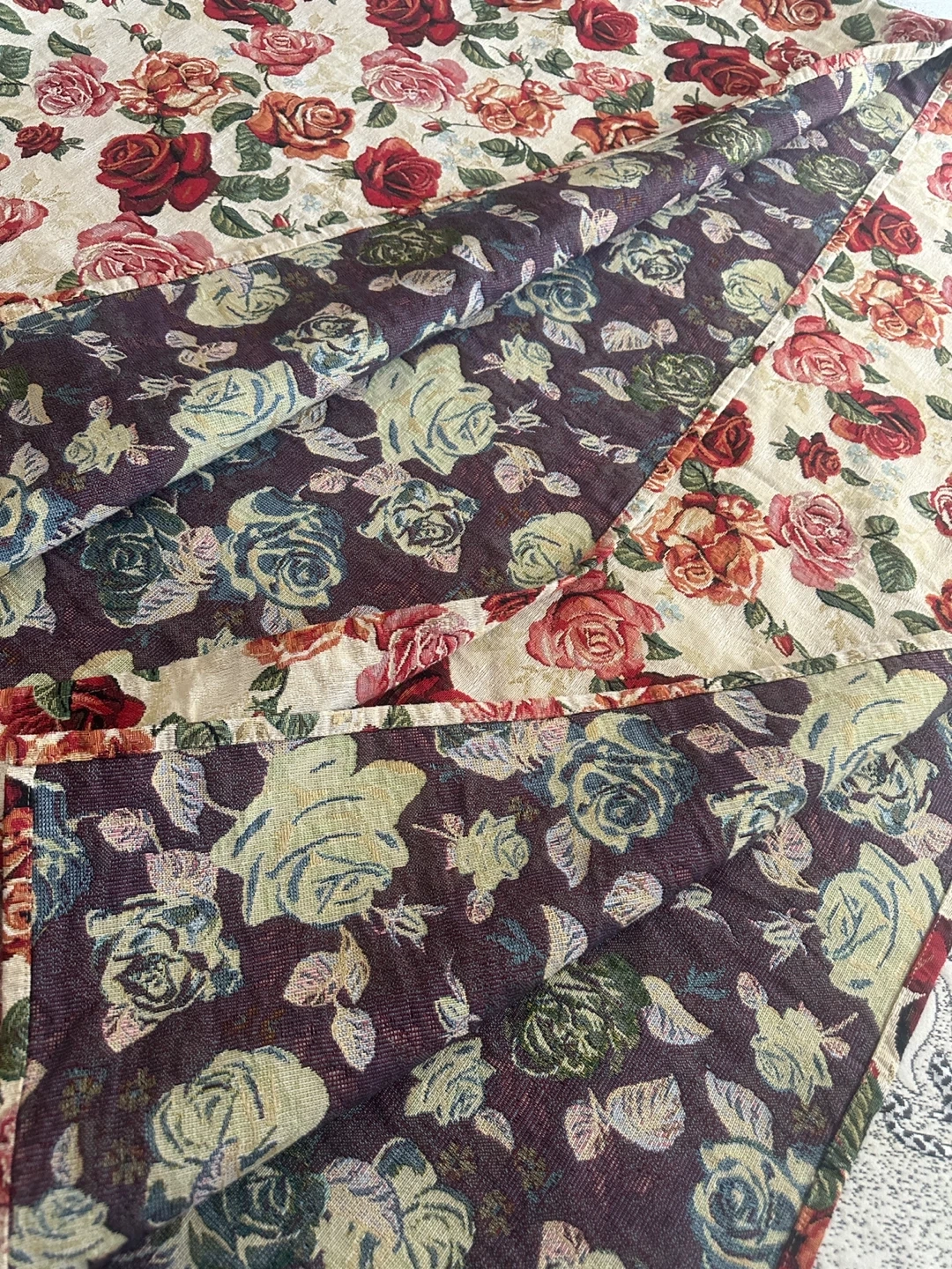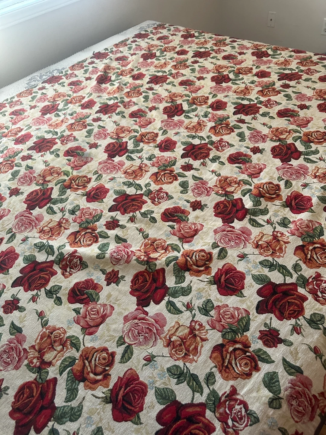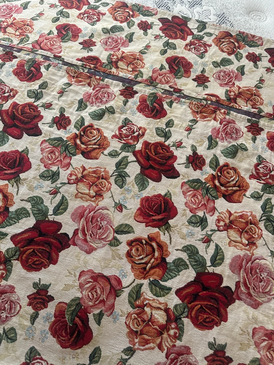 Selling a piece of fabric with a lovely floral pattern. It features a mix of red, pink, and cream roses with green leaves. Great for crafting or home decor projects!