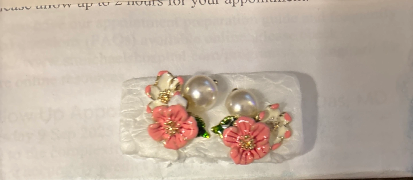 These are some lovely floral earrings with a pearl accent! The flowers are pink and white, and they're in great condition