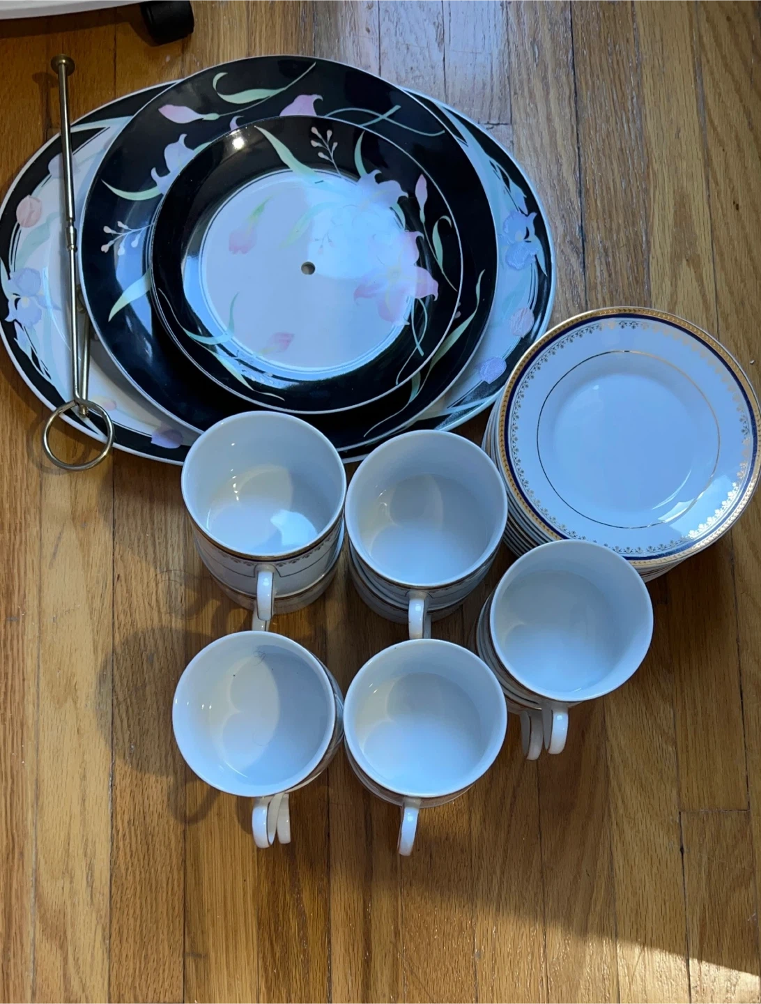 76Selling a lovely floral plate set that includes cups! The plates have a beautiful floral design, and the cups are white with gold and blue accents. They would look lovely on display or for a special occasion!