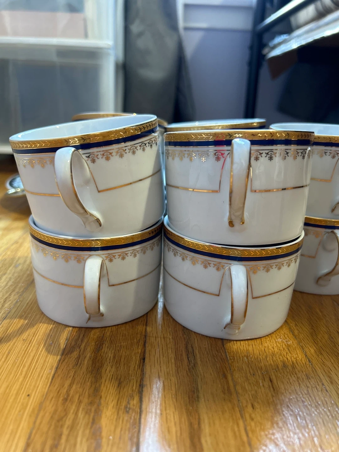 76Selling a lovely floral plate set that includes cups! The plates have a beautiful floral design, and the cups are white with gold and blue accents. They would look lovely on display or for a special occasion!