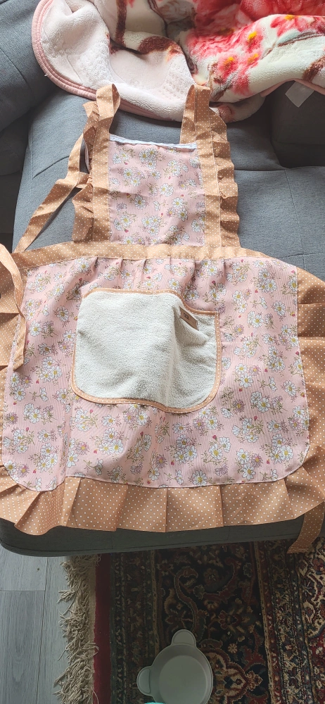 10Selling a cute apron with a floral pattern and polka dot trim! It also has a small towel attached to the front, which is super handy for cooking or baking. Perfect for keeping your clothes clean in style