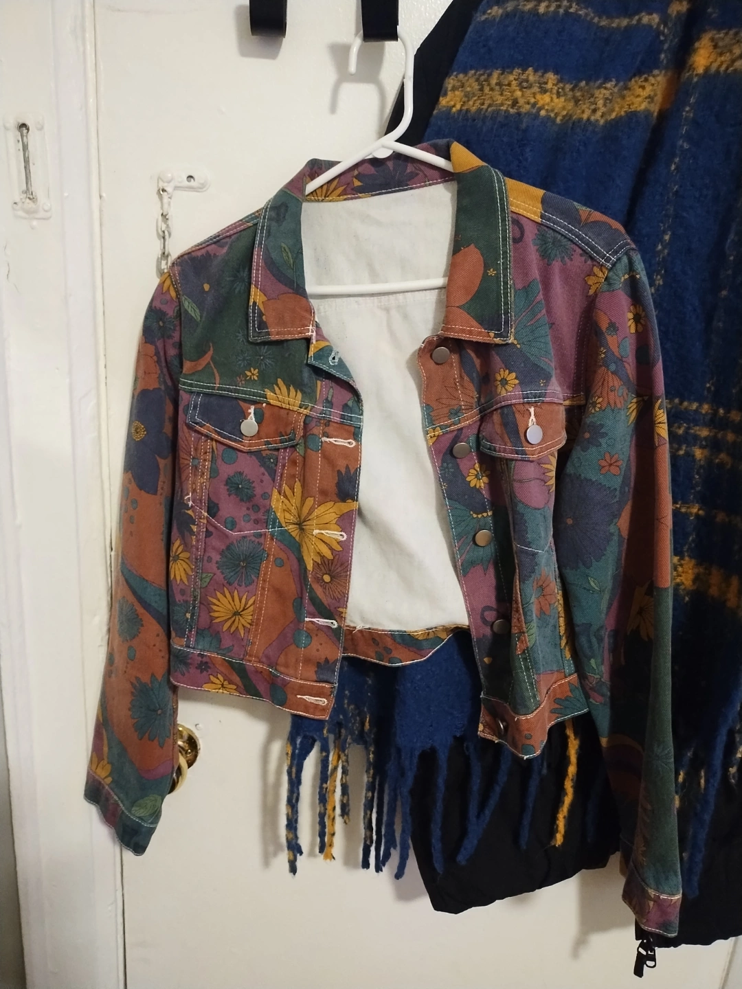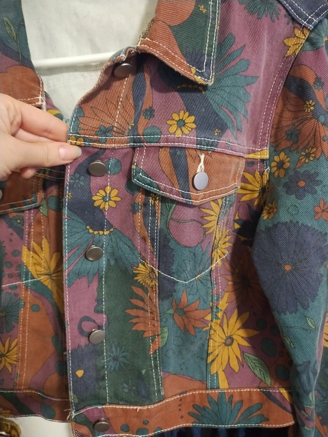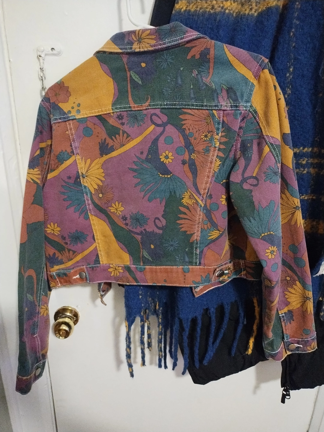 332Cropped jean jacket. Features a colourful floral print. Long sleeves, button closure. Pockets. Size Large womens. Worn only a few times.
