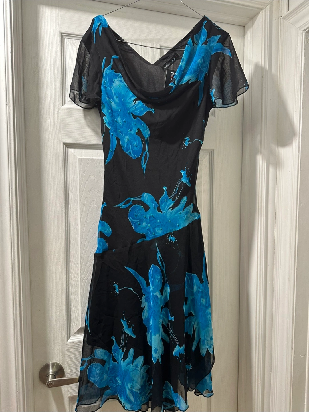 71A beautiful black dress. Featuring a vibrant floral print. The dress has short sleeves. A perfect outfit for a summer evening. Size large but runs small Brand new, tag still on