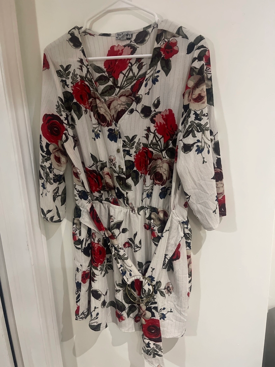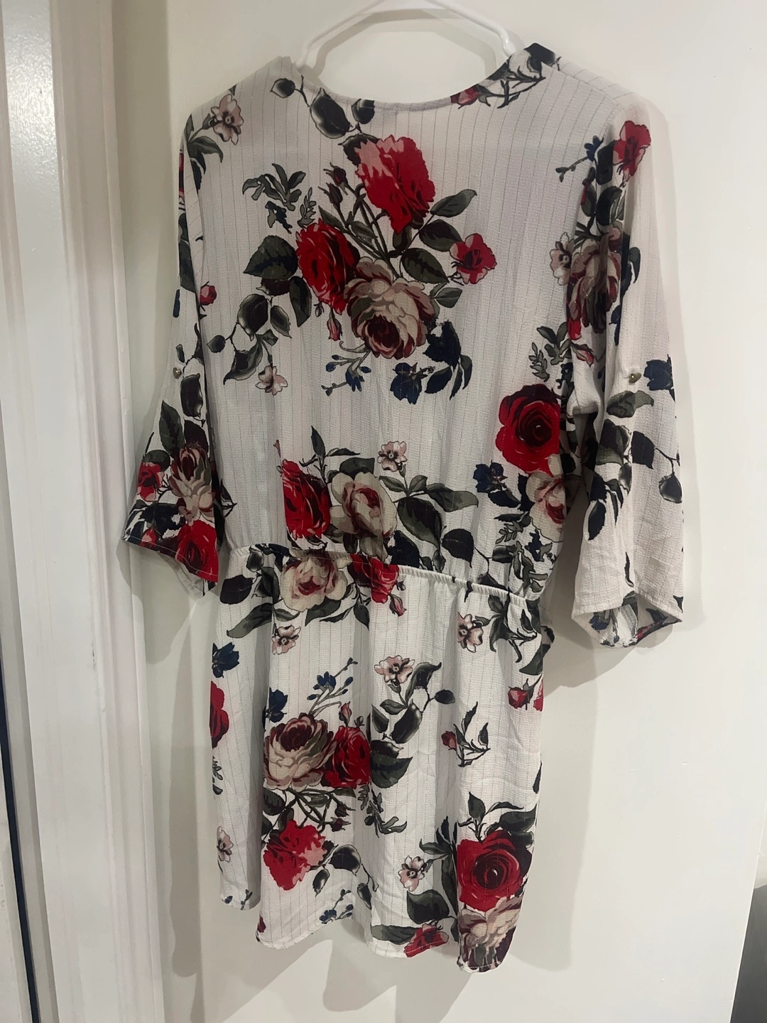 This dress features a beautiful floral print with red and white roses. It has a V-neck and a tie at the waist. Perfect for a sunny day out or a casual event!