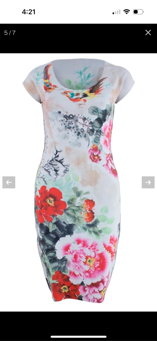 Beautiful floral print dress in excellent condition! The dress features a unique design with vibrant red and pink flowers, and colourful birds. Perfect for a special occasion or a casual day out!