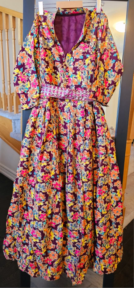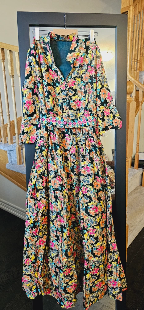 This is a beautiful floral print dress. It features a vibrant mix of colours and a unique pattern, making it a standout piece for any wardrobe. It has a flattering silhouette and is perfect for a variety of occasions. It's in great condition and ready for a new home!