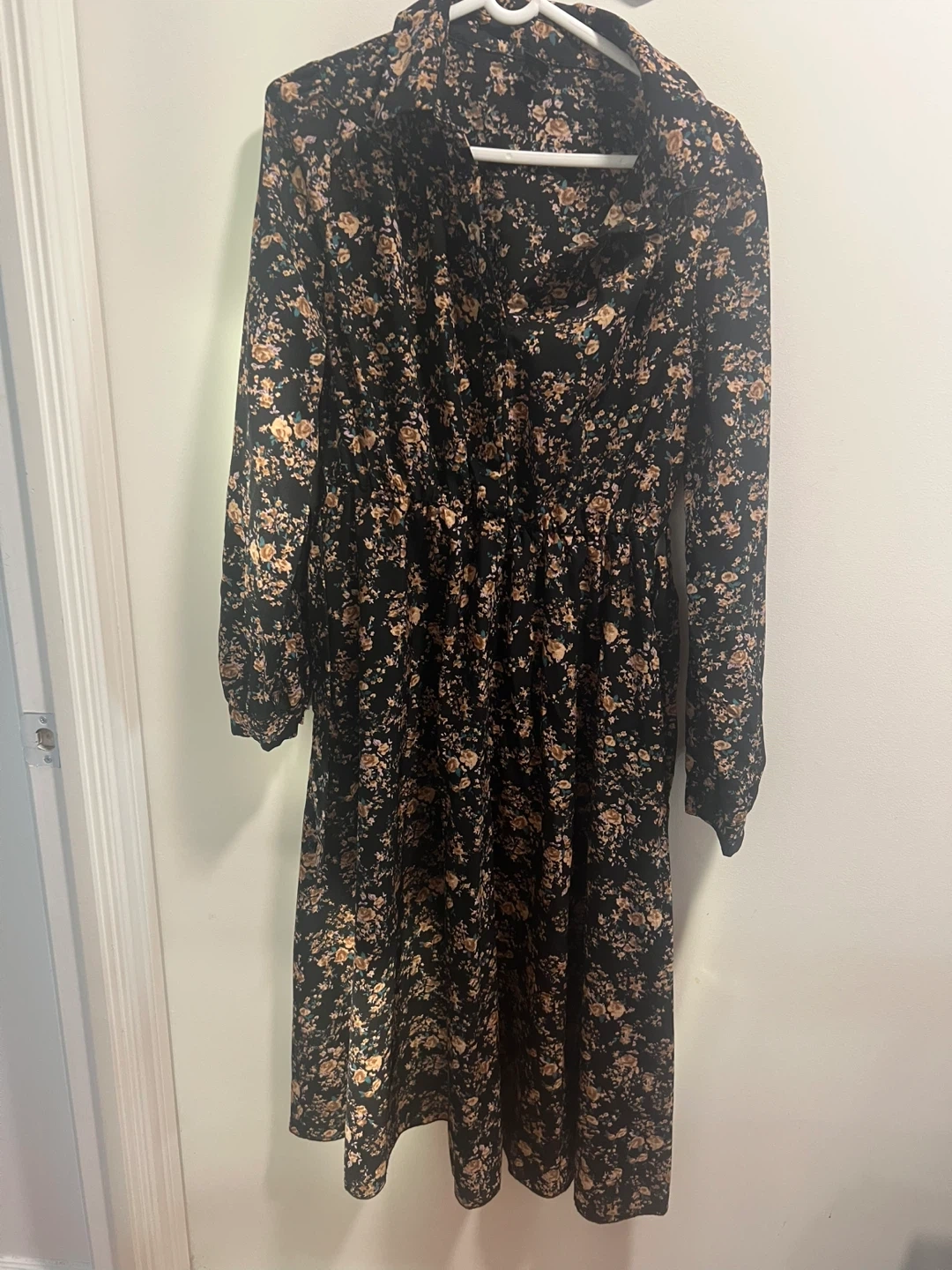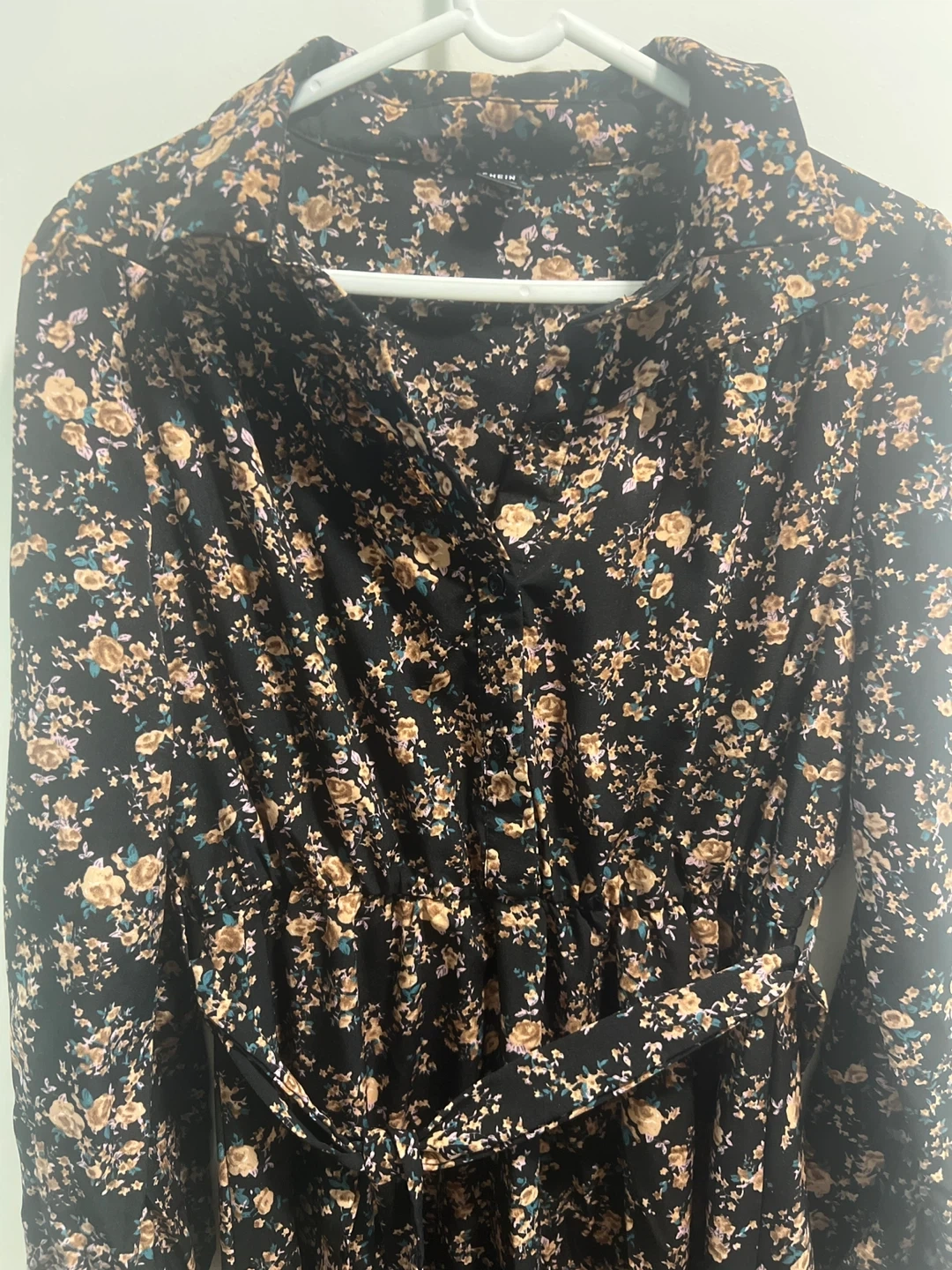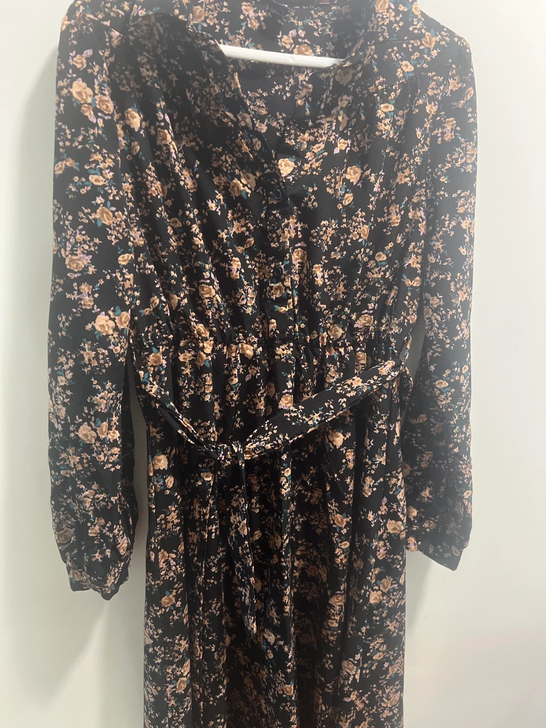 70Here's a lovely floral print dress! It features a long sleeve design and a tie at the waist. Perfect for adding a touch of elegance to your wardrobe. Good Fall add on. Priced to sell
