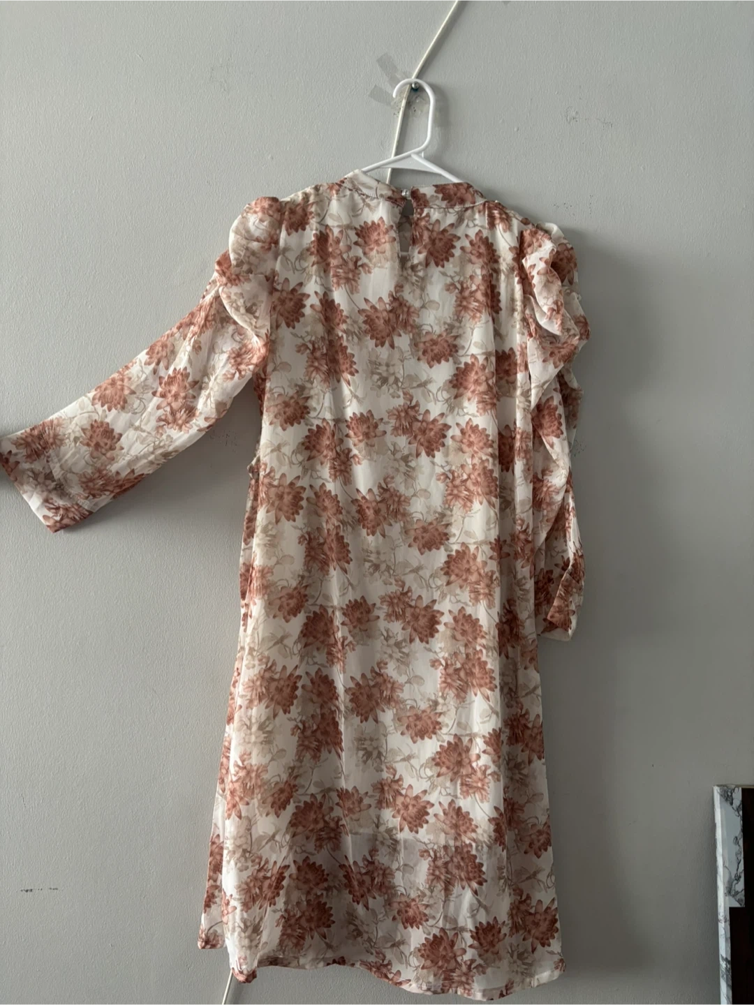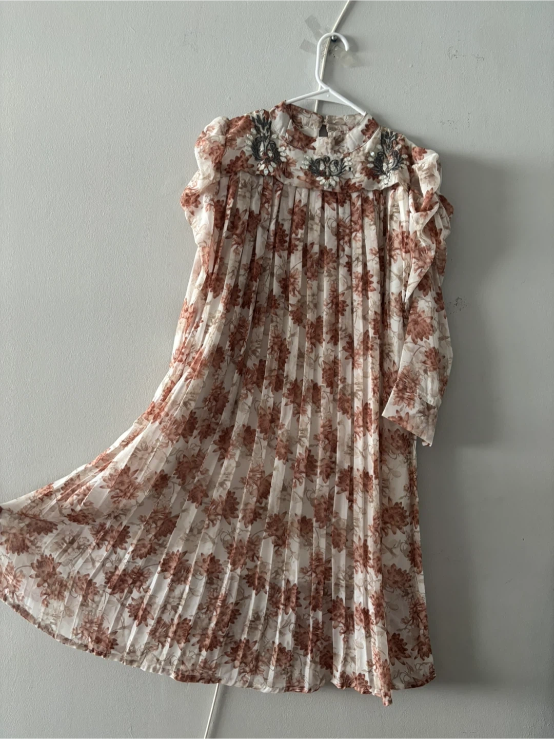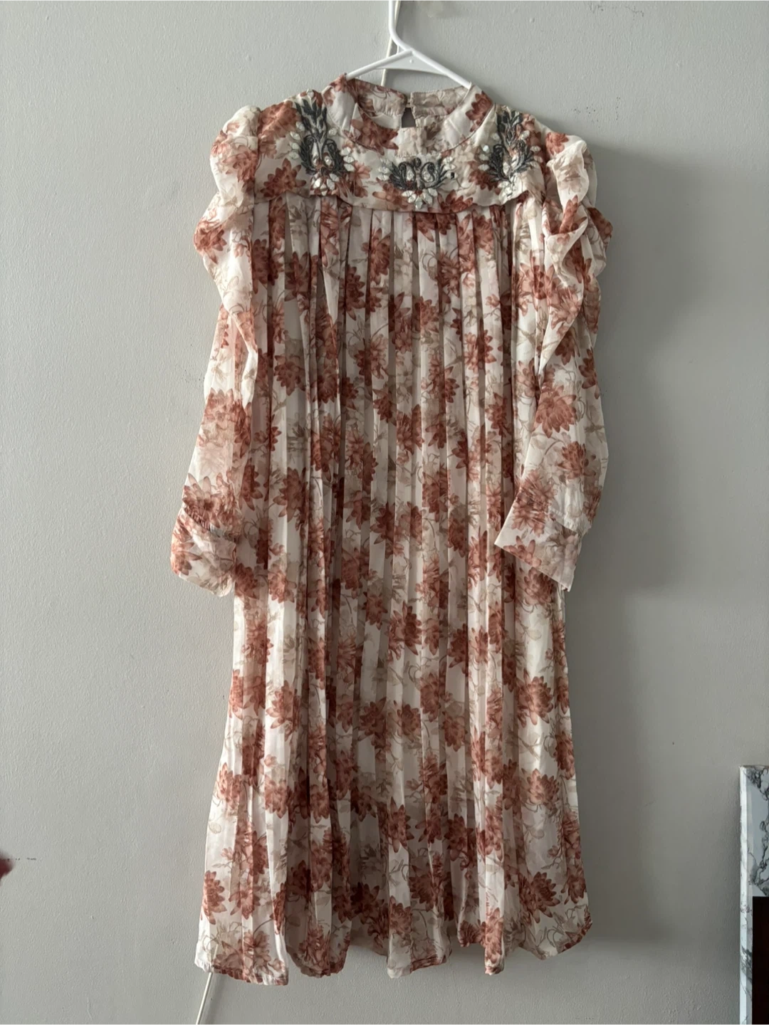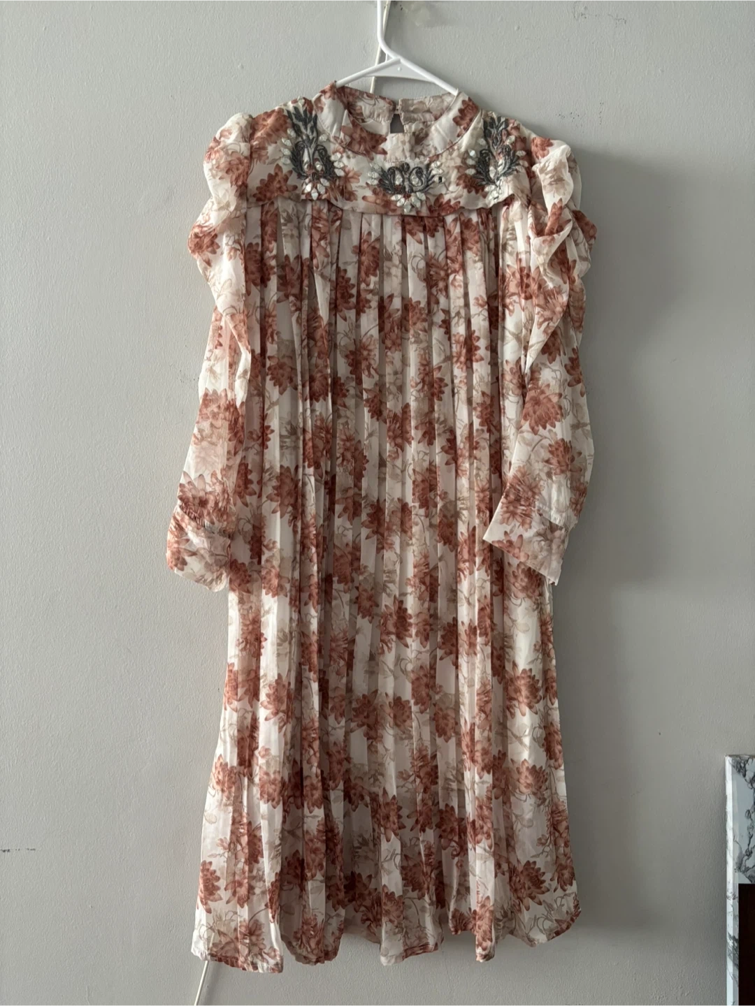 Selling a lovely floral print dress with pleated detailing! The dress features long sleeves and a unique ruffled shoulder design. It's in great condition and perfect for a special occasion or a stylish everyday look