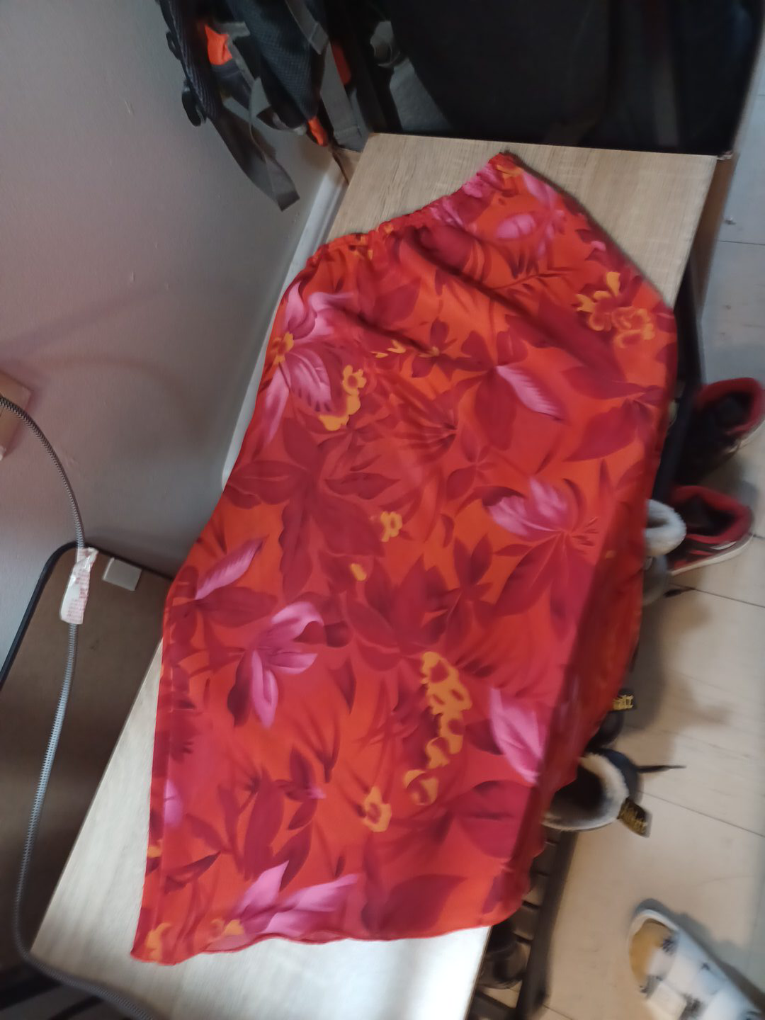 85Selling a vibrant floral print skirt in shades of red and orange. It's perfect for adding a pop of colour to your wardrobe! The skirt features a comfortable elastic waistband.