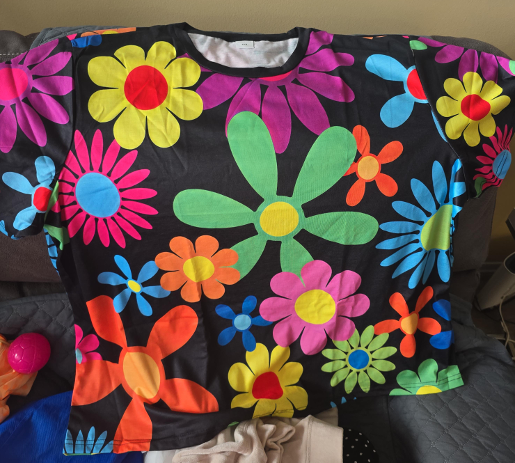 184This fun T-shirt features a vibrant floral print on a black background. The flowers come in various colours like pink, yellow, green, orange, and blue. It looks to be in good condition!