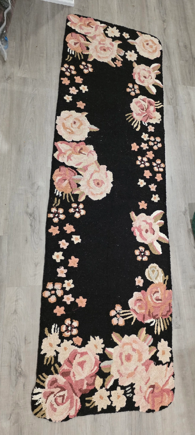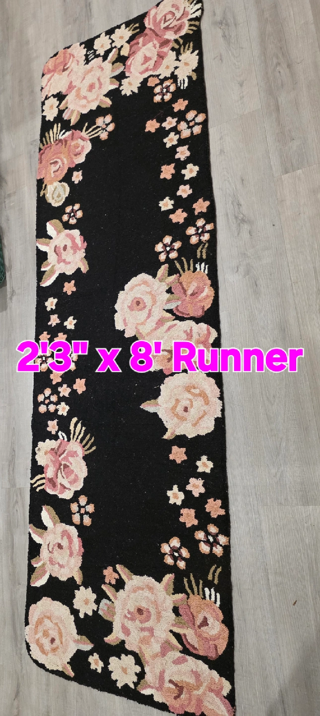 This floral runner rug measures 2'3" x 8'. It features a black background with pink and peach floral designs. It's in great condition and would add a touch of charm to any hallway or room