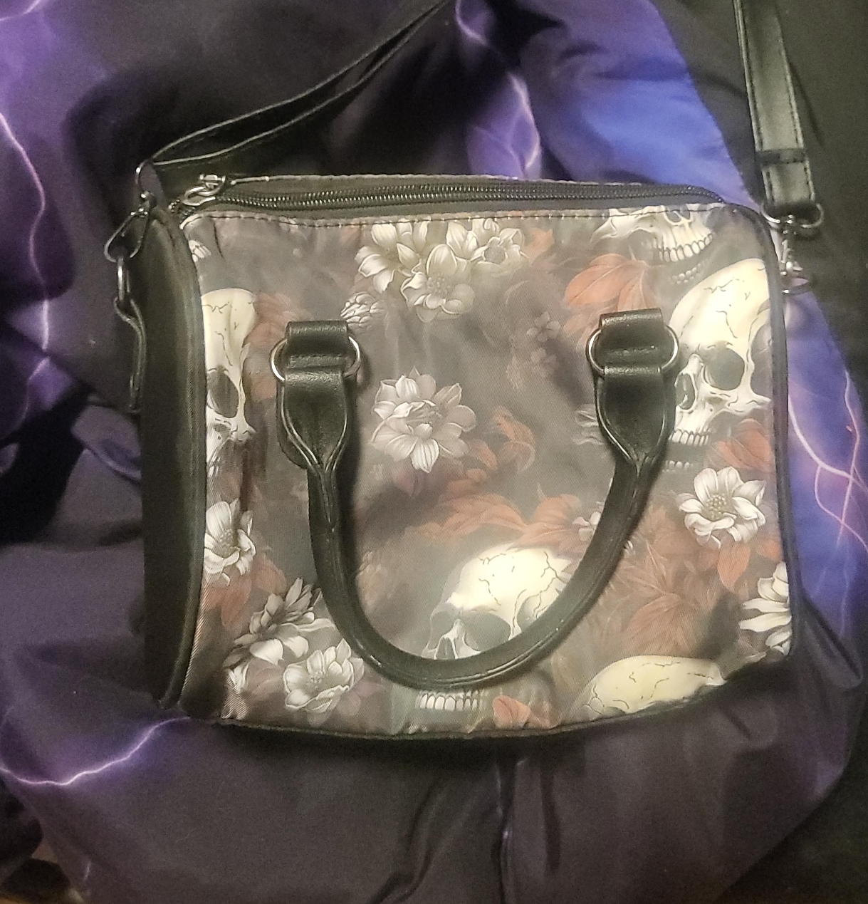 Here’s a satchel bag with a unique floral and skull print! It has both handles and a detachable shoulder strap. Great for adding a bit of edge to your outfit!