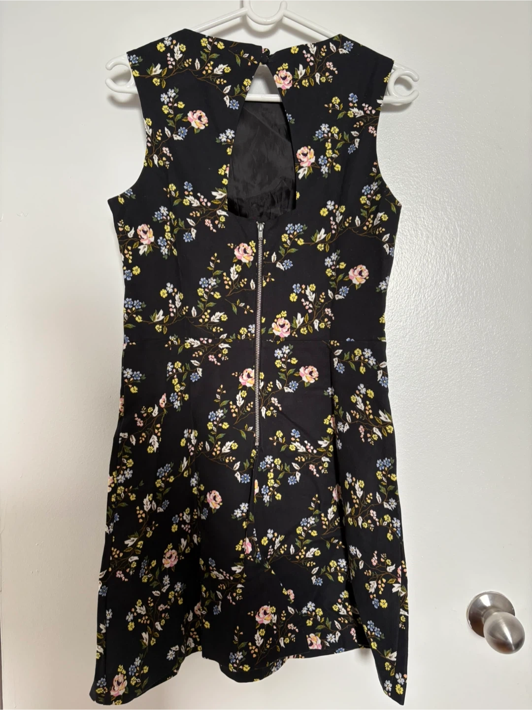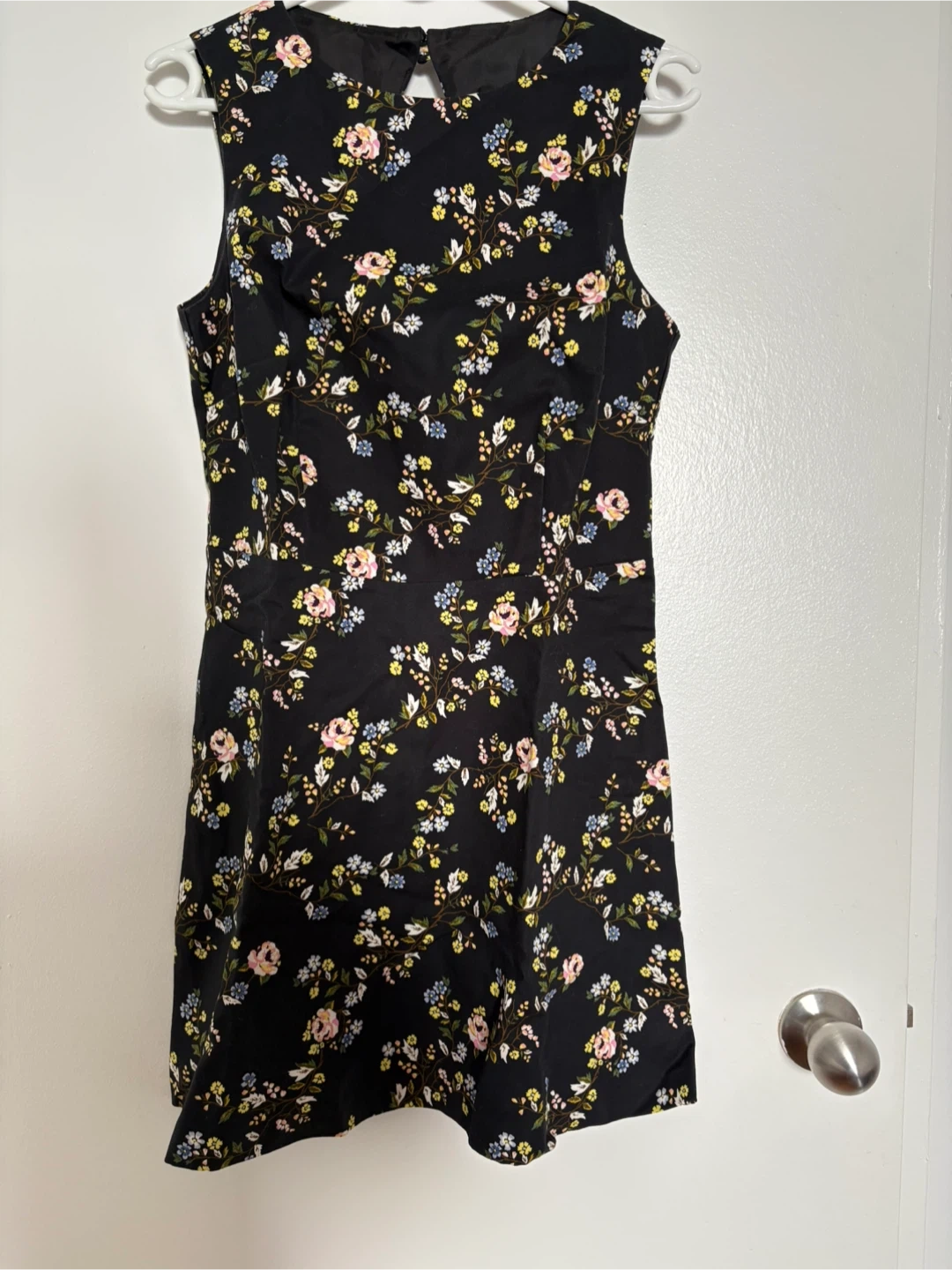 68This is a cute sleeveless dress with a black background and a colourful floral print. It has a zipper in the back and is in great condition